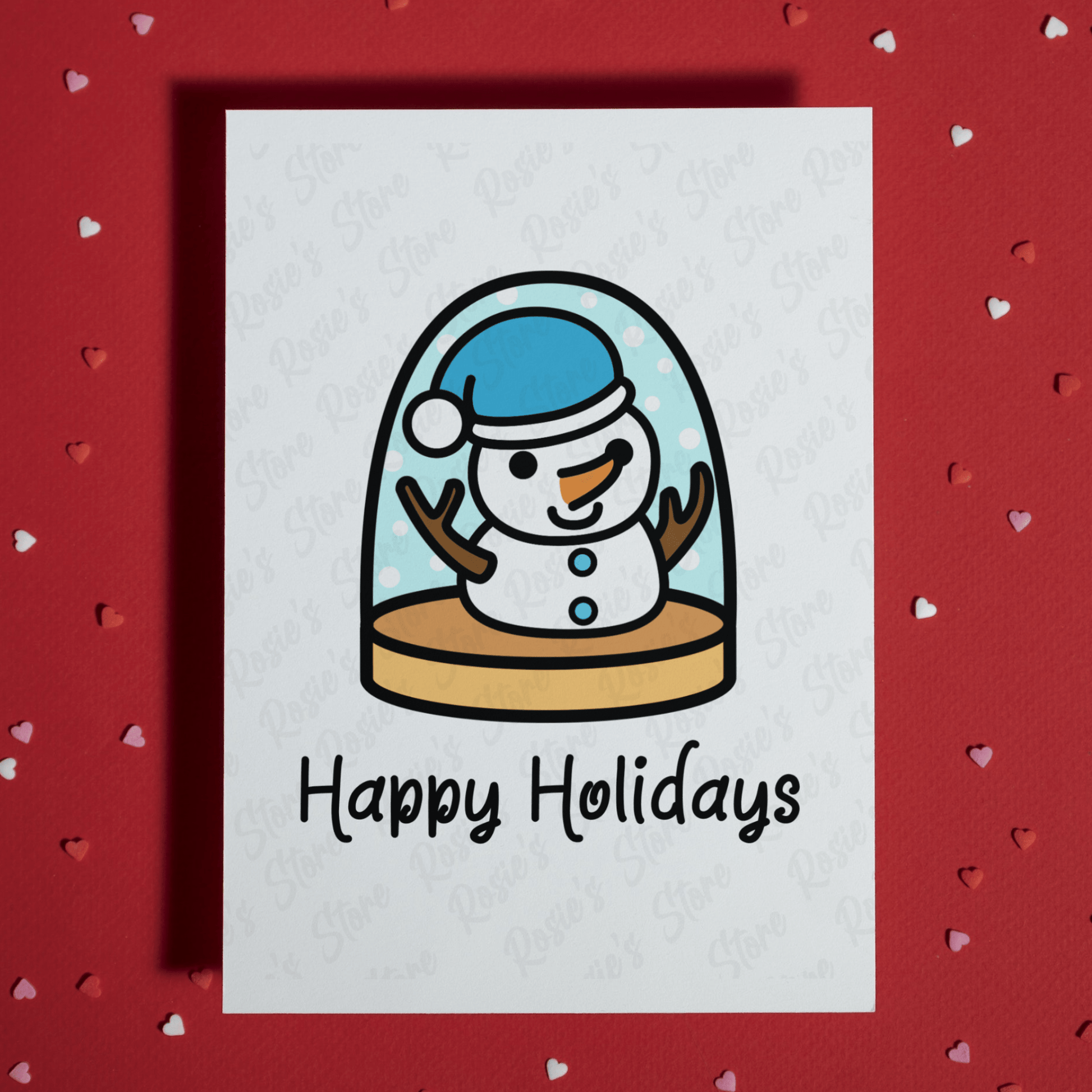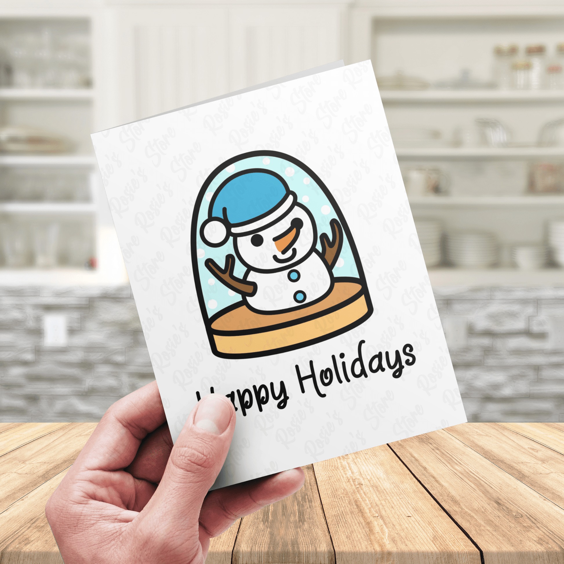 The front of the card simply says, "Happy Holidays" encapsulating the joy and merriment of the season. The charming snowman in the snow globe adds a touch of whimsy to your holiday greetings, making it a wonderful choice for friends, family, and colleagues.