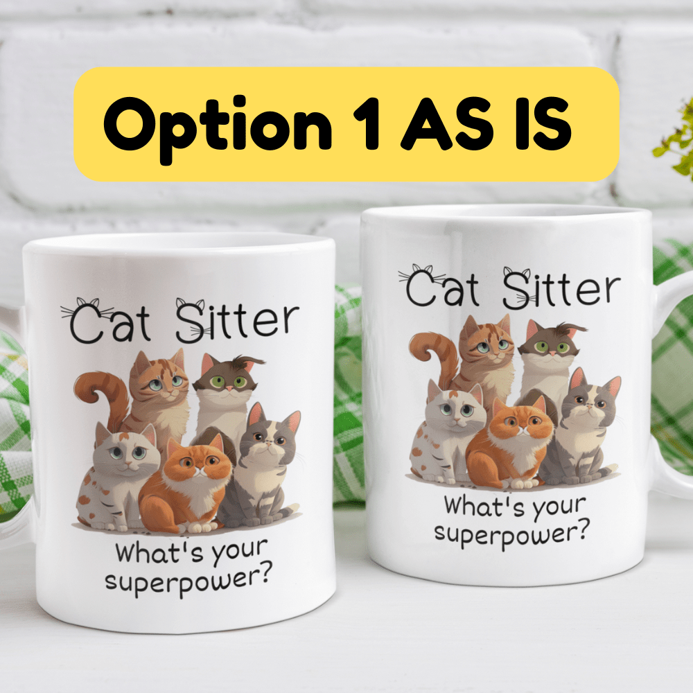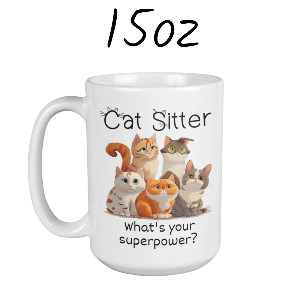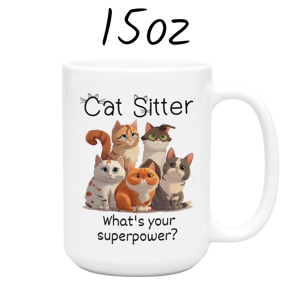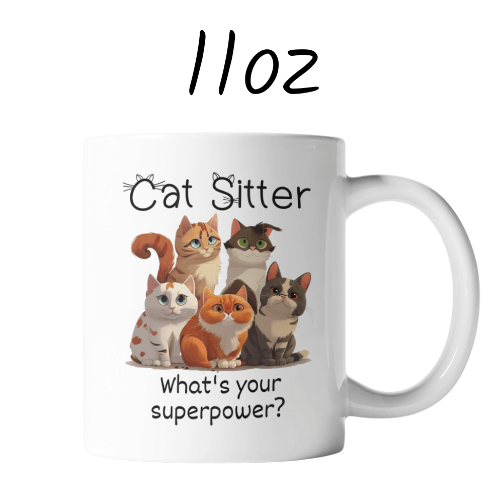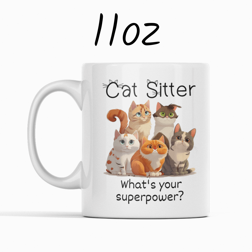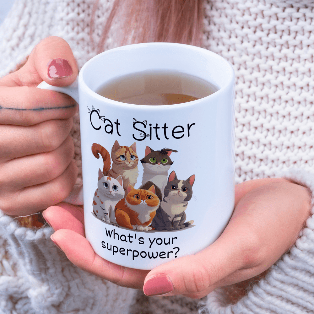 This fun and heartwarming coffee mug features a cute illustration of a few playful cats, with the bold title “Cat Sitter”, followed by the cheeky question: “What’s your superpower?” 🦸♀️🐈