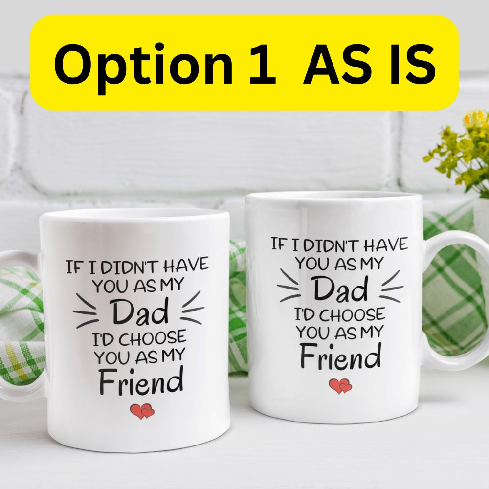 Option 1: Standard Design 💙 This mug features a heartwarming message: "If I didn't have you as my Dad I'd choose you as my friend." It's a touching tribute to the strong bond between father and child, perfect for expressing your love and gratitude.