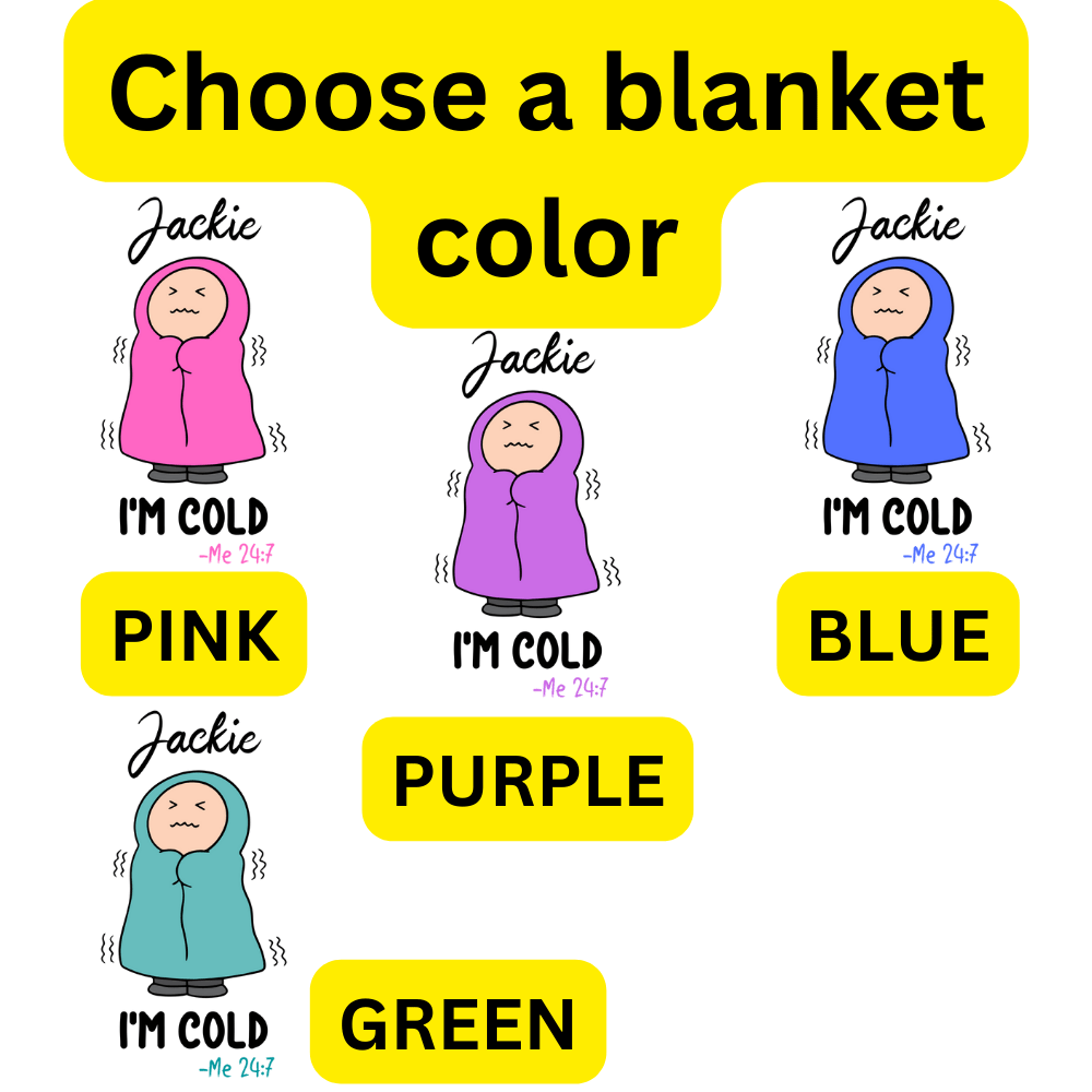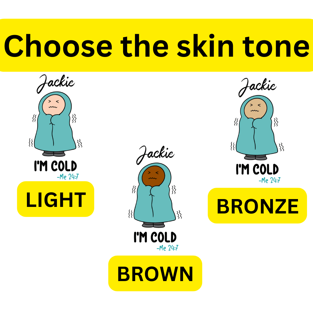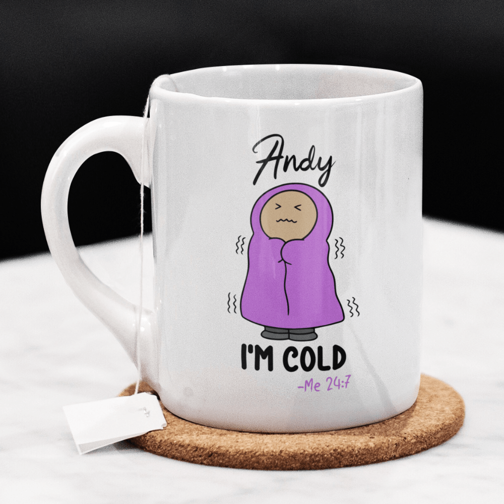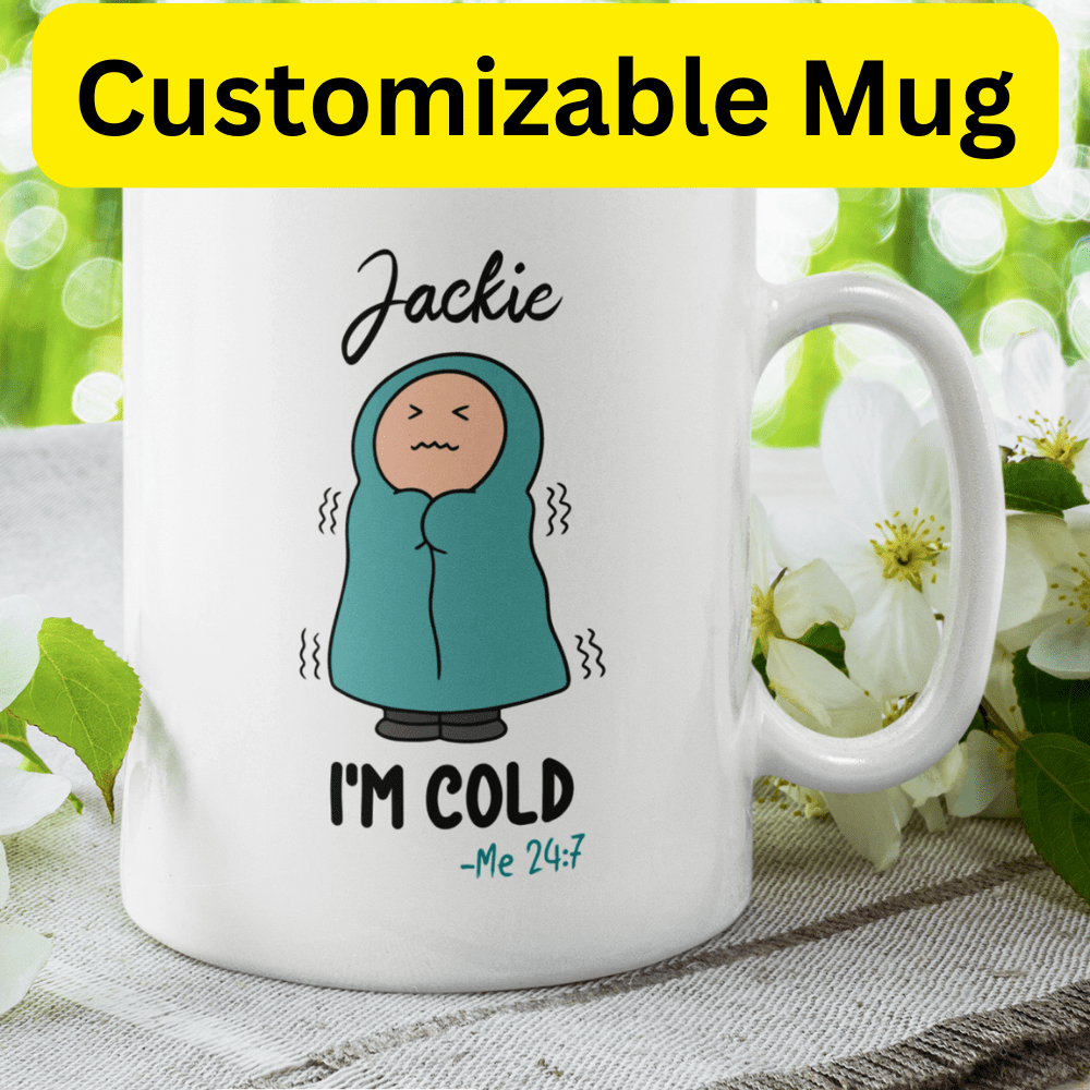 • Adorable Design: The both sides of the mug features an endearing cartoon drawing of a person wrapped snugly in a blanket, accompanied by the humorous quote, "'Name', I'm cold. -Me 24:7." It's a playful nod to the perpetual chill that some of us experience year-round.
