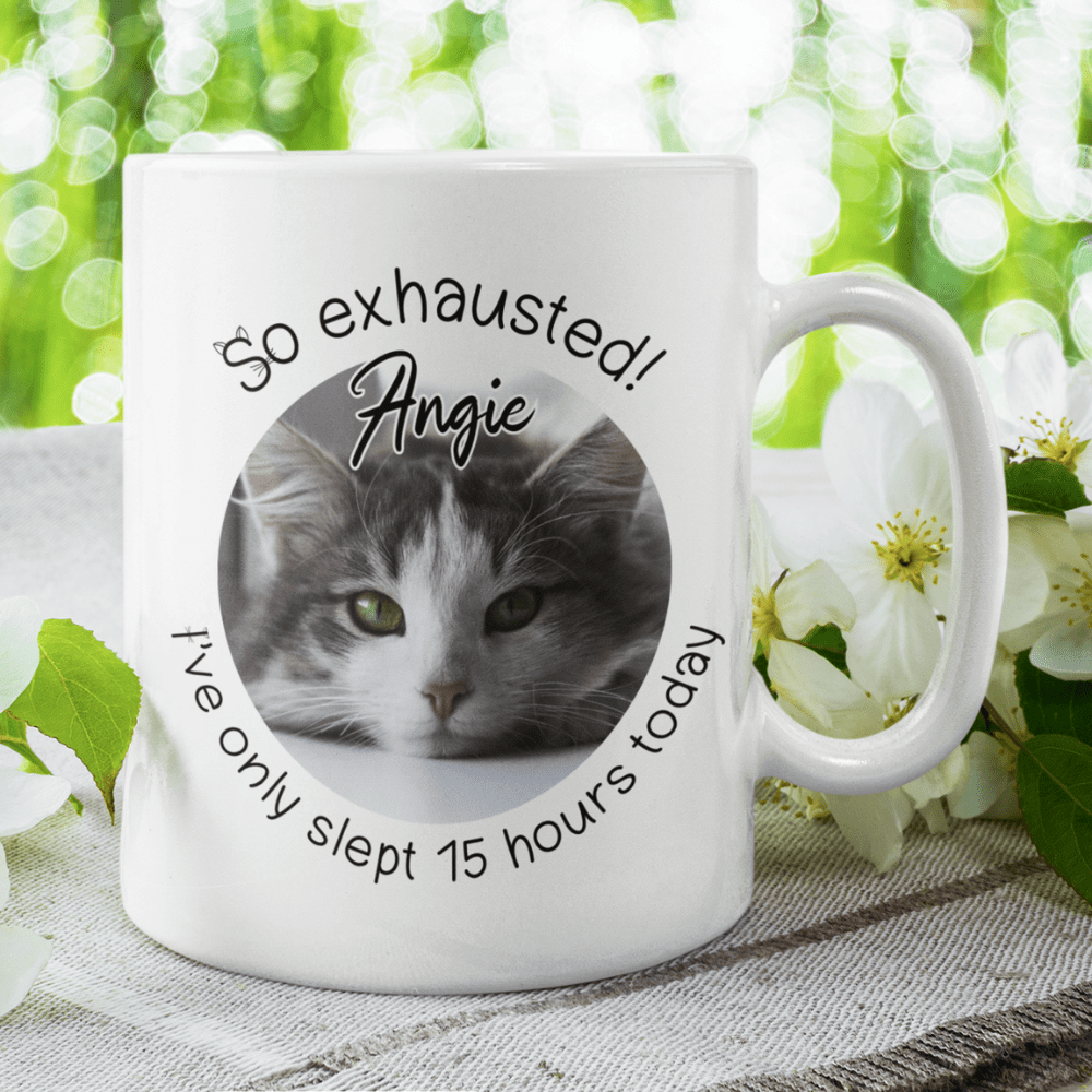 Embrace the adorable exhaustion that comes with being a cat lover. Start your day with a smile as you sip your favorite beverage from this personalized mug. It's not just a coffee cup; it's a celebration of the endless love and sleepy moments you share with your feline friend. Order yours today and keep the cat naps coming!