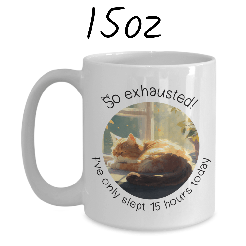 Calling all cat aficionados! If you've ever felt the intense fatigue of your feline friend's daily sleep schedule, this mug is your badge of honor. With its humorous message and an adorable cartoon cat, it's the purrfect addition to your coffee or tea routine.