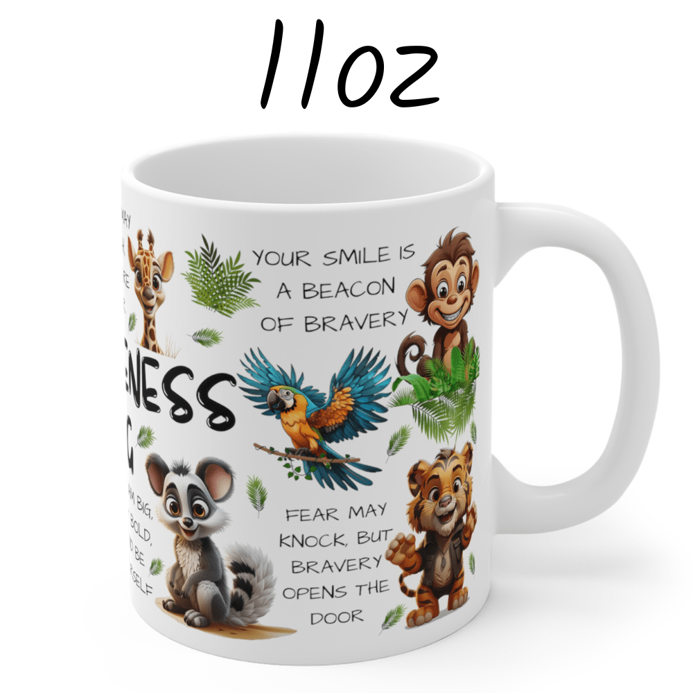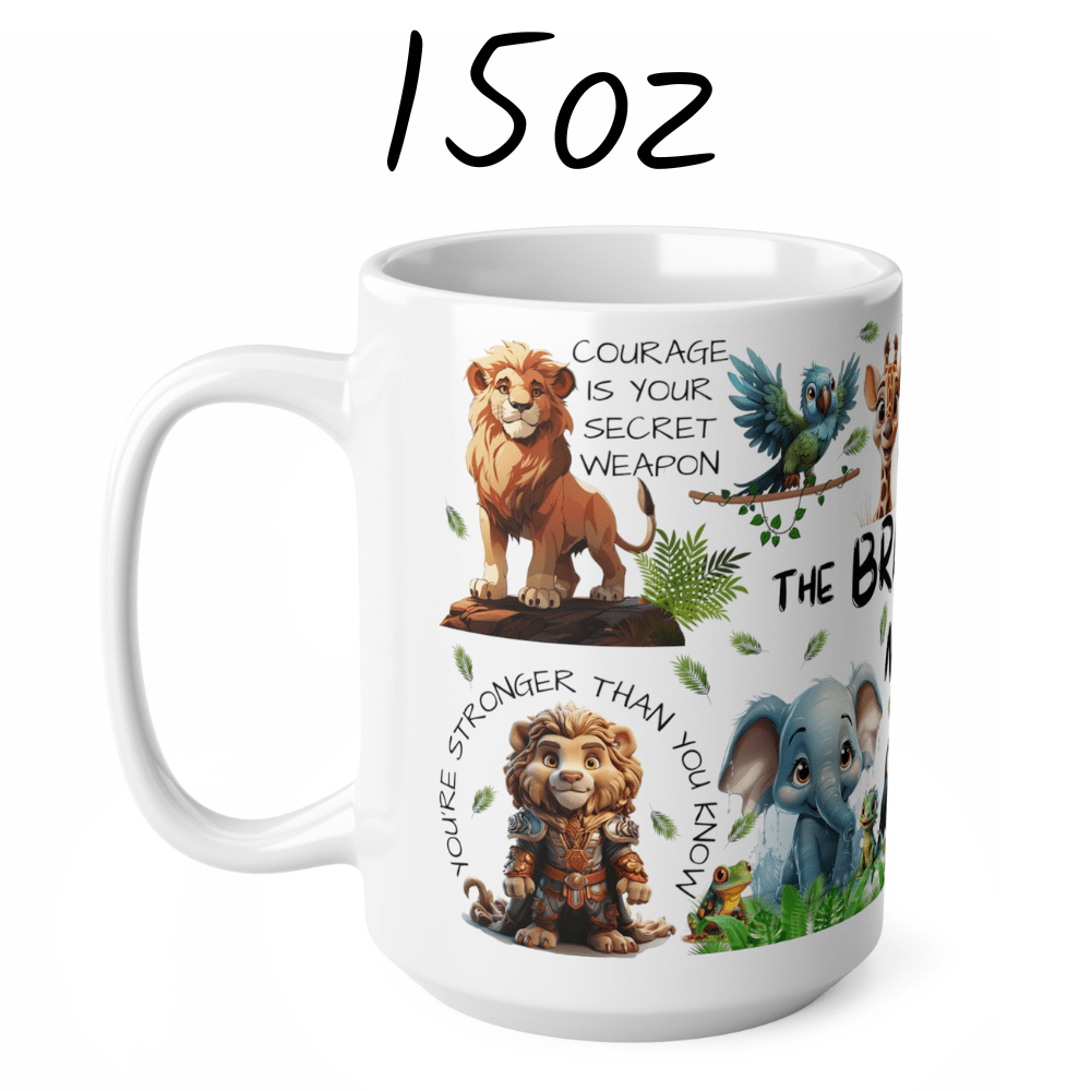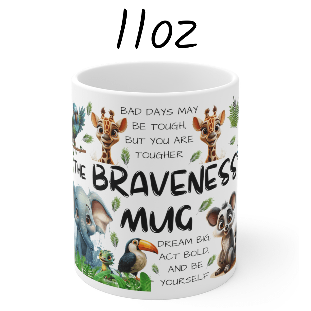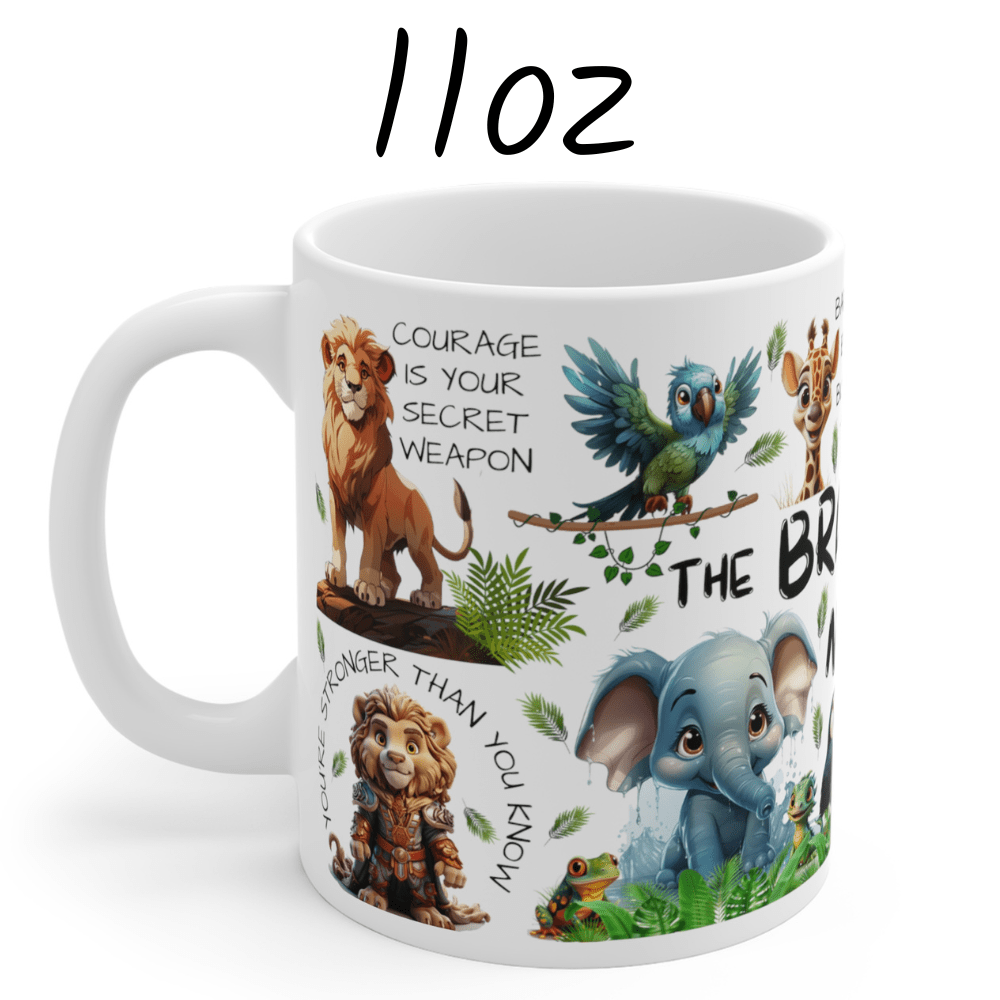 Introducing "The Braveness Mug" a white ceramic coffee mug adorned with charming cartoon drawings of jungle animals. This mug is not only a delightful addition to your collection but also a heartfelt and inspiring gift for those facing challenging times.