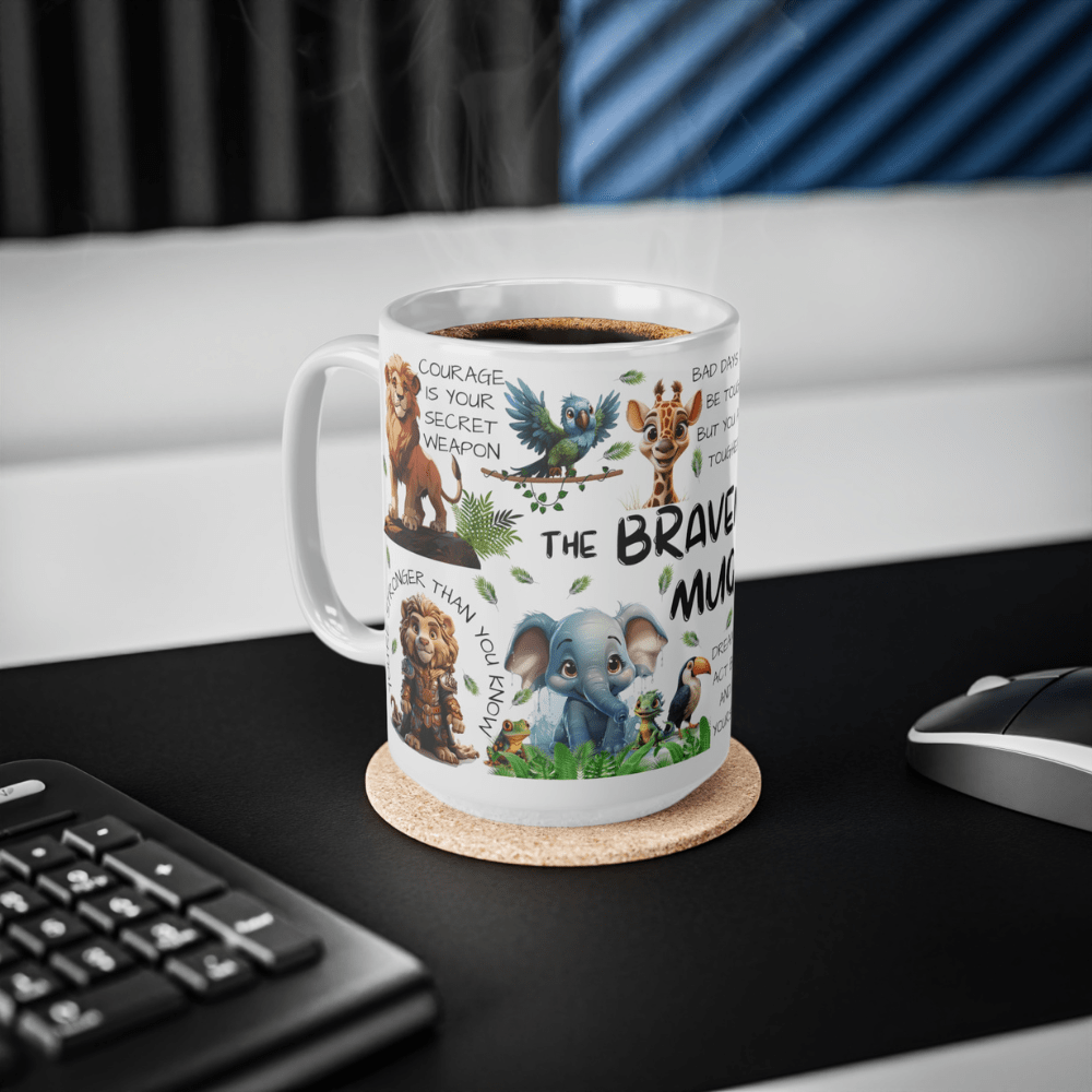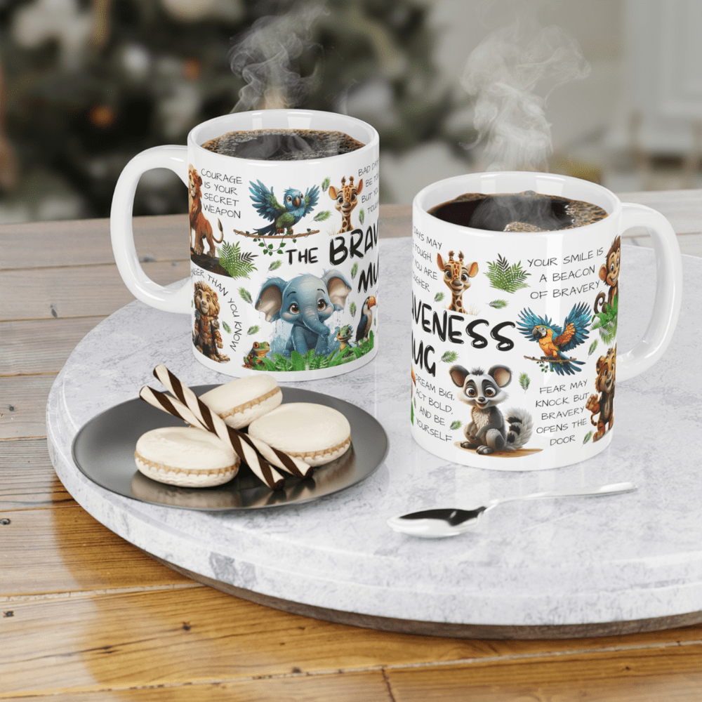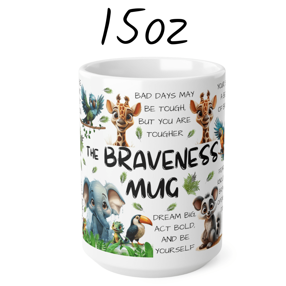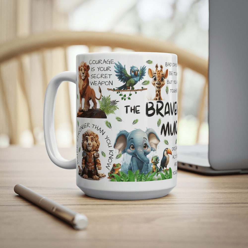 Introducing "The Braveness Mug" a white ceramic coffee mug adorned with charming cartoon drawings of jungle animals. This mug is not only a delightful addition to your collection but also a heartfelt and inspiring gift for those facing challenging times.