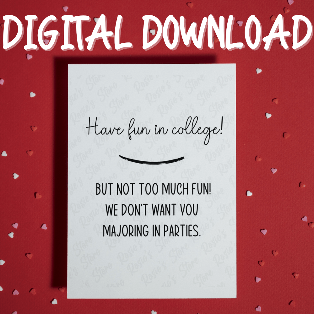 Send off your college-bound loved one with a touch of humor and heartfelt wishes with our digital download greeting card! Our "Have fun in college! But not too much fun! We don't want you majoring in parties." card is the perfect way to show your love and support as they embark on this exciting journey.