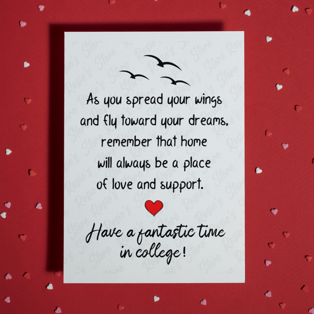 Celebrate the start of an exciting college journey with our heartfelt greeting card! Our "As you spread your wings and fly towards your dreams, remember that home will always be a place of love and support. Have a fantastic time in college!" card is the perfect way to send warm wishes and encouragement to your college-bound loved one.