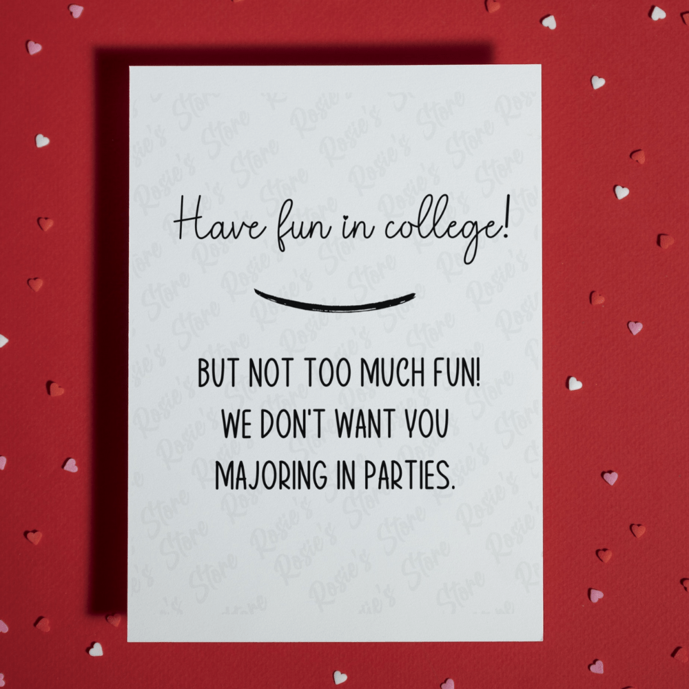 Celebrate the start of an exciting college journey with a touch of humor and love with our fun and witty greeting card! Our "Have fun in college! But not too much fun! We don't want you majoring in parties." card is the perfect way to send off your college-bound loved one with a smile and a gentle reminder.