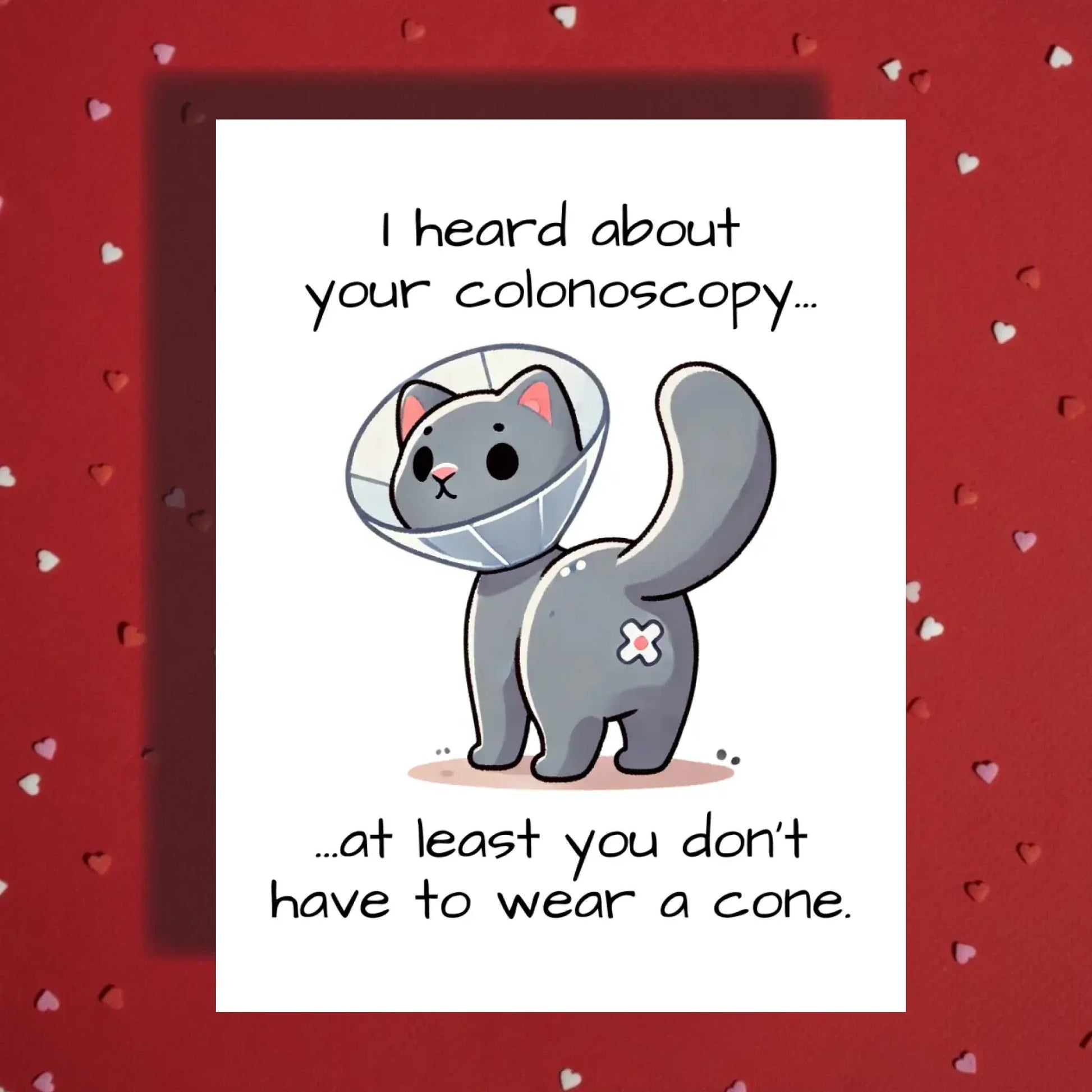 Introducing our lighthearted and funny colonoscopy greeting card: "I heard about your colonoscopy...at least you don't have to wear a cone," featuring a cute cartoon drawing of a cat with a medical cone around its neck and a little bandage on its butt. Perfect for bringing some laughter to someone’s recovery, this card is a playful way to say “get well soon” with a smile!