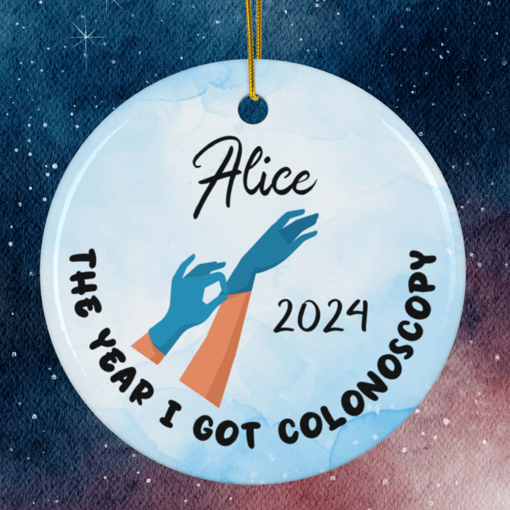 - The front of the ornament features a playful and charming design with the personalized message: "'Name' The year I got colonoscopy 'Year'." It’s a fun way to commemorate a health milestone with a smile.