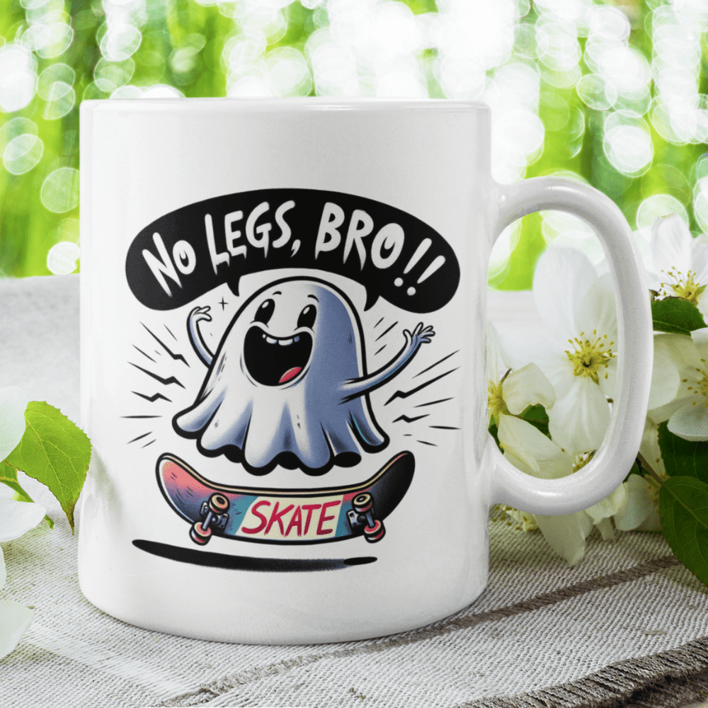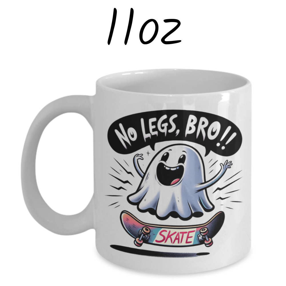 Introducing our hilarious white ceramic coffee mug featuring an adorable cartoon ghost on a skateboard with the caption "No legs, Bro!!" 🤣