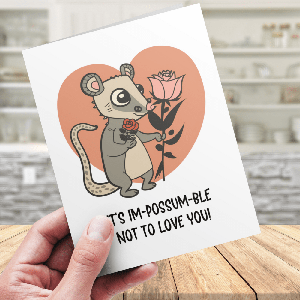 Spread some adorable love with our charming greeting card! Our "It's im-possum-ble not to love you!" card features a cute cartoon drawing of a possum that will melt hearts and bring smiles to your loved ones.