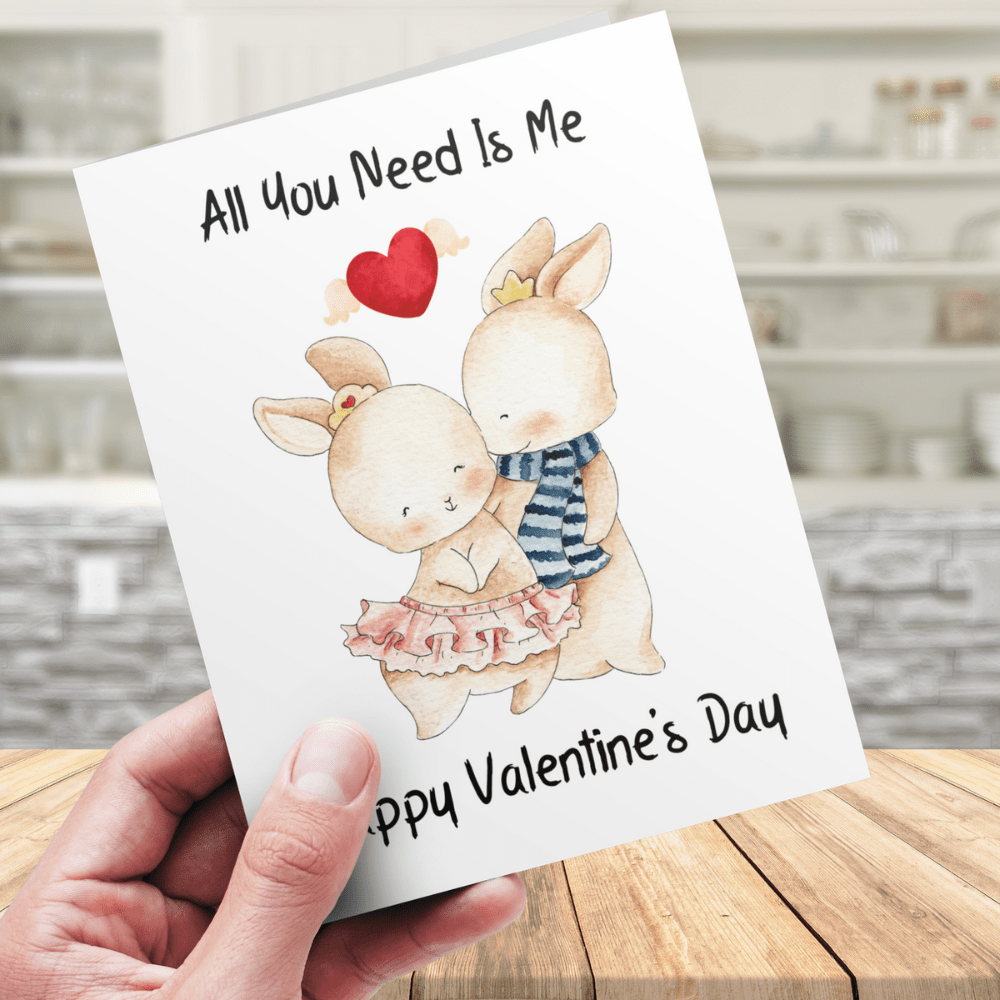 Celebrate the power of love with our heartfelt greeting card that proclaims, "All you need is me. Happy Valentine's Day." This card is a perfect way to express your affection and remind your special someone of the irreplaceable role they play in your life.