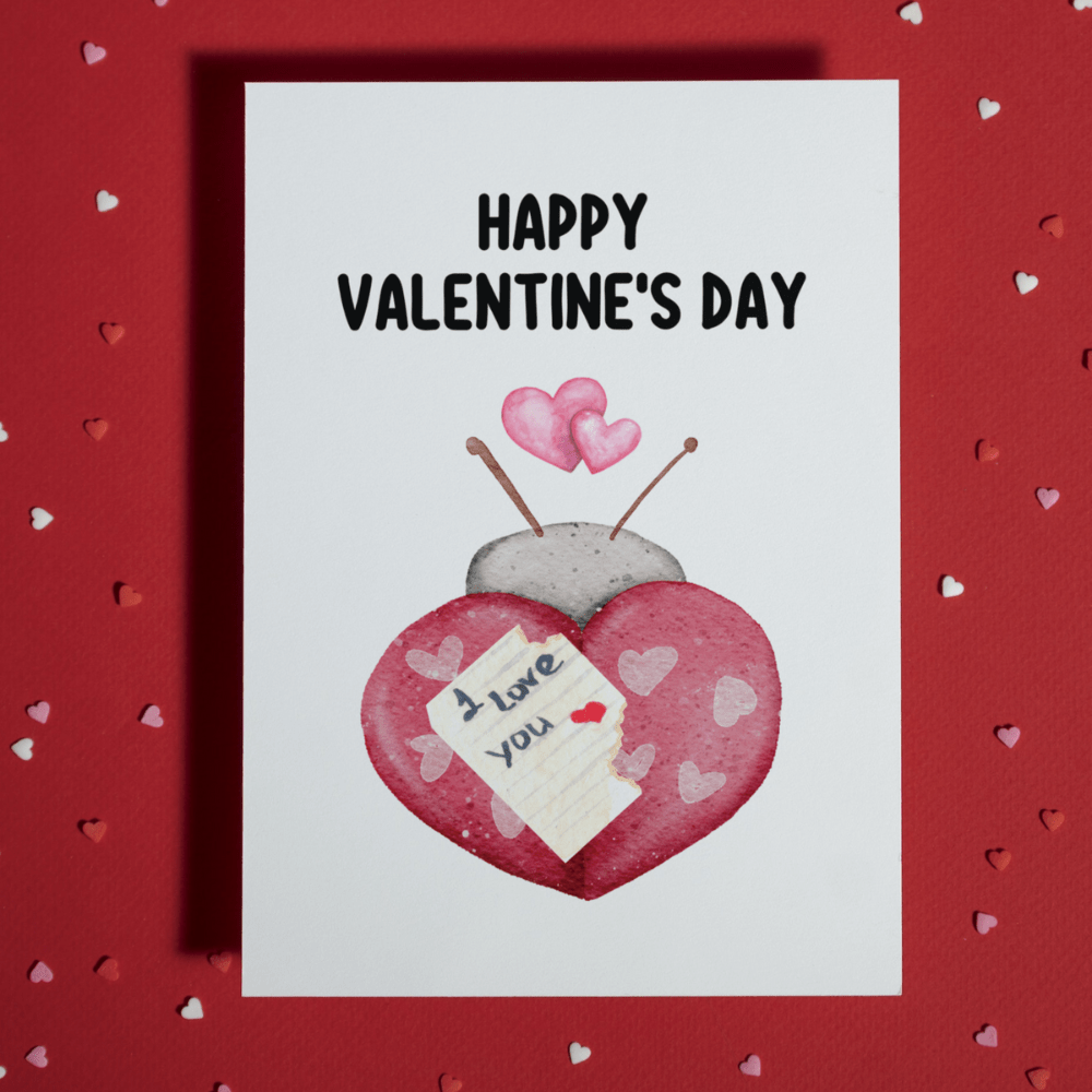 Celebrate love and affection with our delightful greeting card! Our "Happy Valentine's Day. I love you" card features a cute cartoon drawing of a ladybug, symbolizing luck and warmth, to express your heartfelt message.