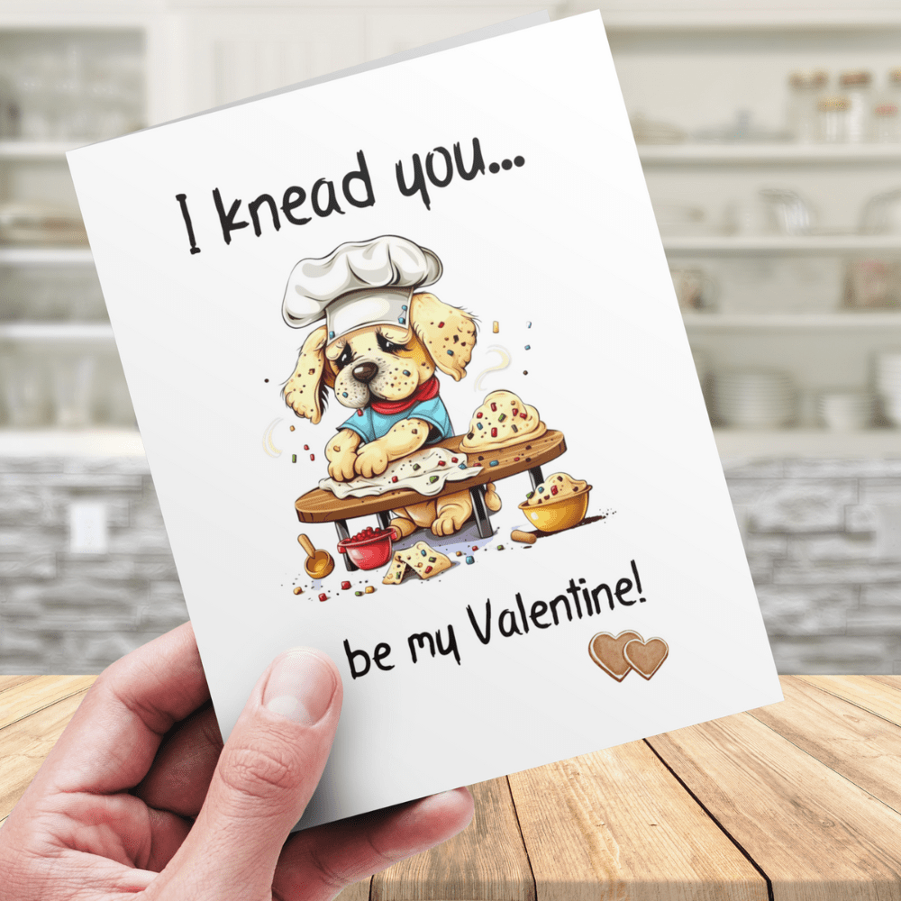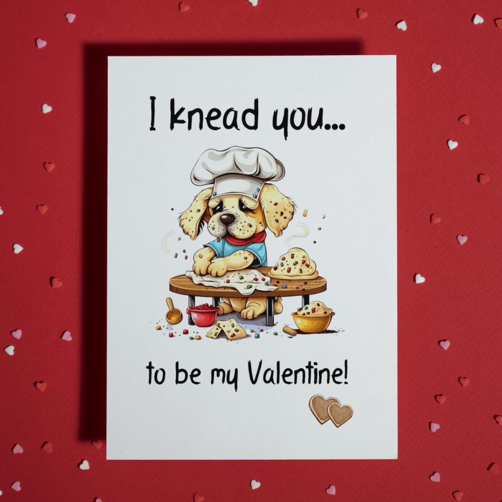 Celebrate love and baking with our adorable greeting card! Our "I knead you...to be my Valentine!" card features a cute cartoon drawing of a chef cook dog kneading dough, adding a playful and sweet touch to your Valentine's Day message.