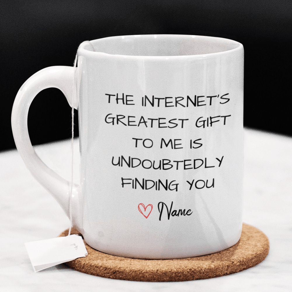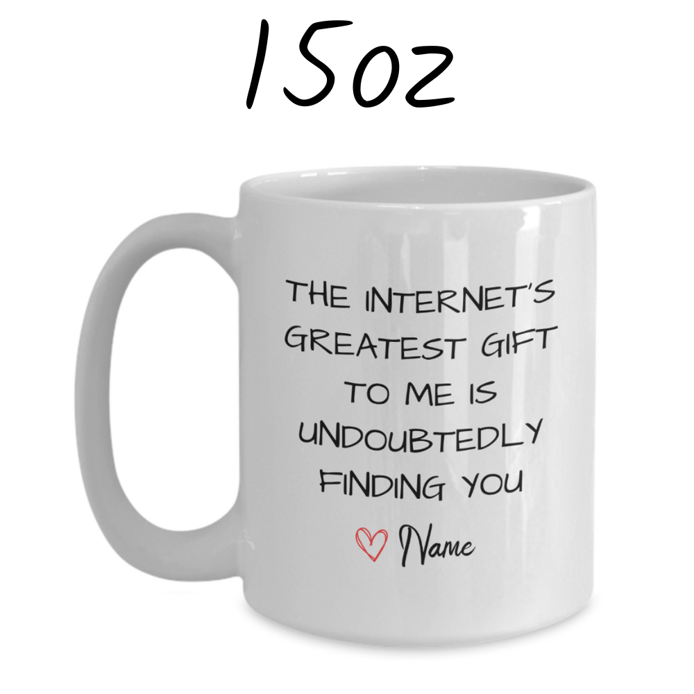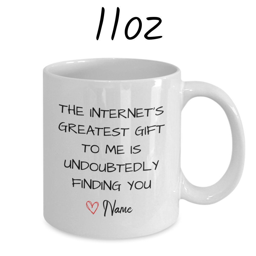 Experience the joy of finding your soulmate with our delightful white ceramic coffee mug, designed to celebrate the special bond between you and your partner. Featuring the heartwarming message, "The internet's greatest gift to me is undoubtedly finding you, 'Name'", this mug is a heartfelt expression of love and gratitude.