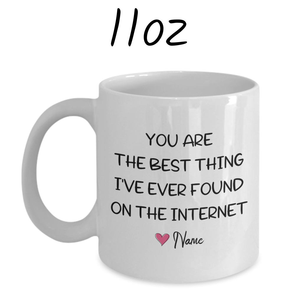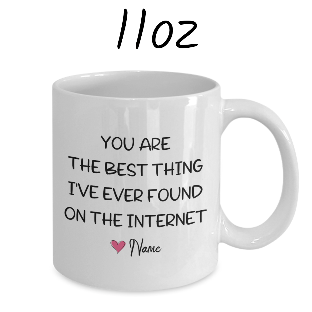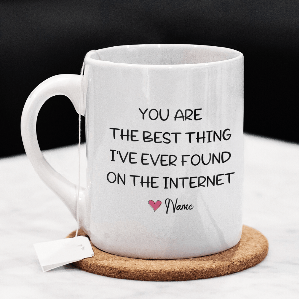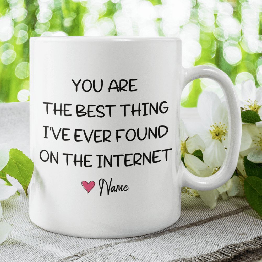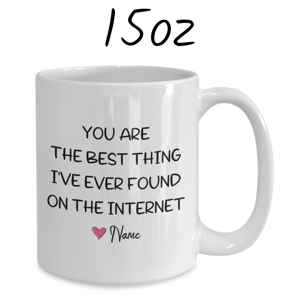 Express your deepest affection with our charming white ceramic coffee mug, designed to commemorate the special bond between you and your partner. Featuring the heartfelt message, "You are the best thing I've ever found on the internet," accompanied by a personalized name, this mug is a heartfelt declaration of love.