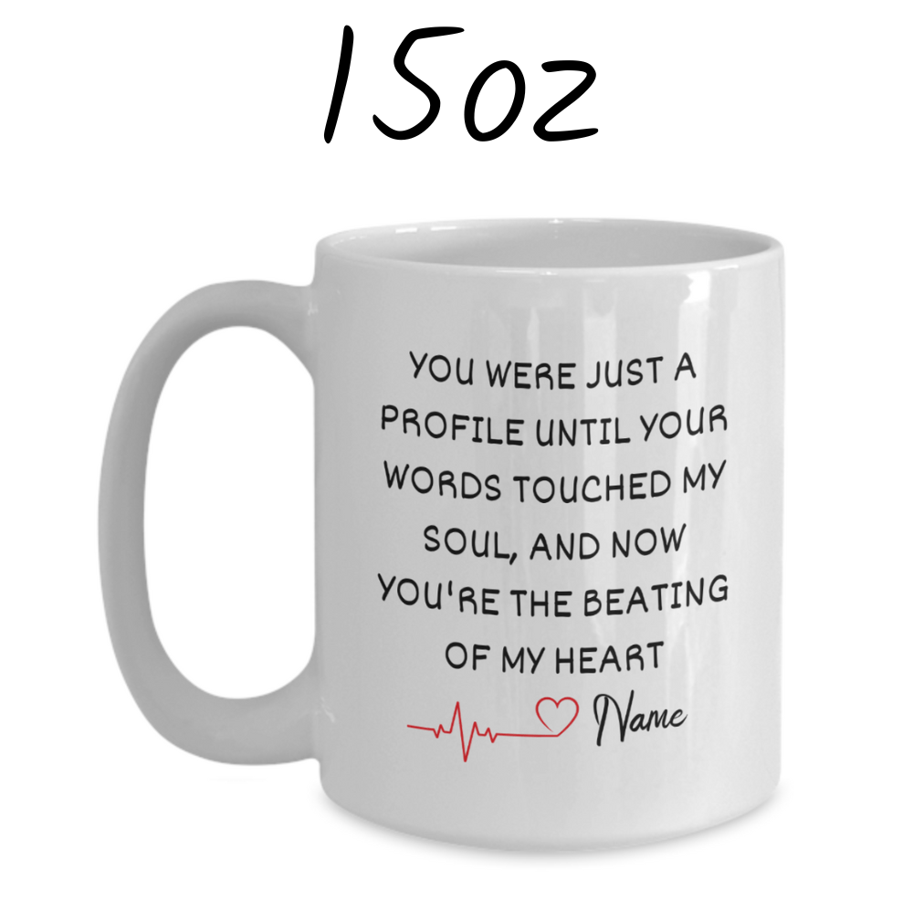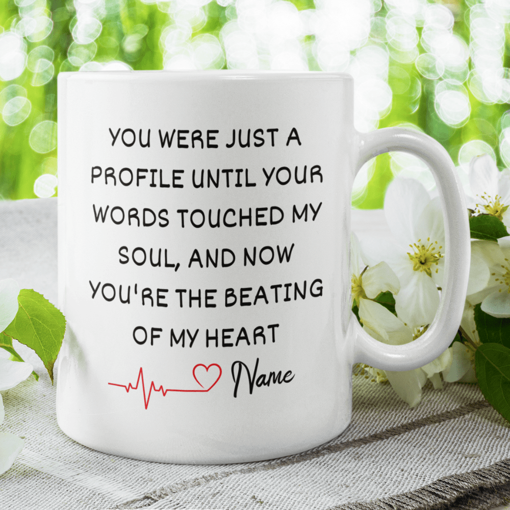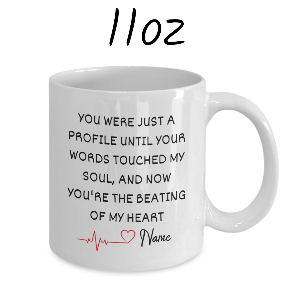 Celebrate the depth of your connection with our enchanting white ceramic coffee mug, featuring the heartfelt message: "You were just a profile until your words touched my soul, and now you're the beating of my heart." Add a personal touch by customizing the mug with your name, making it a cherished keepsake that honors your unique bond.
