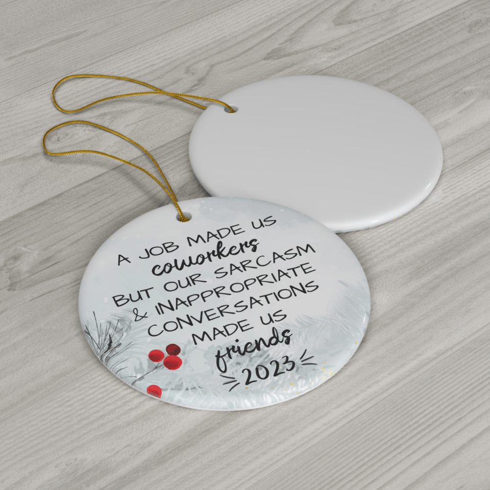 🎄🤣 Celebrate your office camaraderie with our Ceramic Funny Coworker Ornament, because let's face it, a job made you coworkers, but your shared sarcasm and inappropriate conversations made you friends! Choose between two fantastic options to add a touch of humor to your holiday decor.