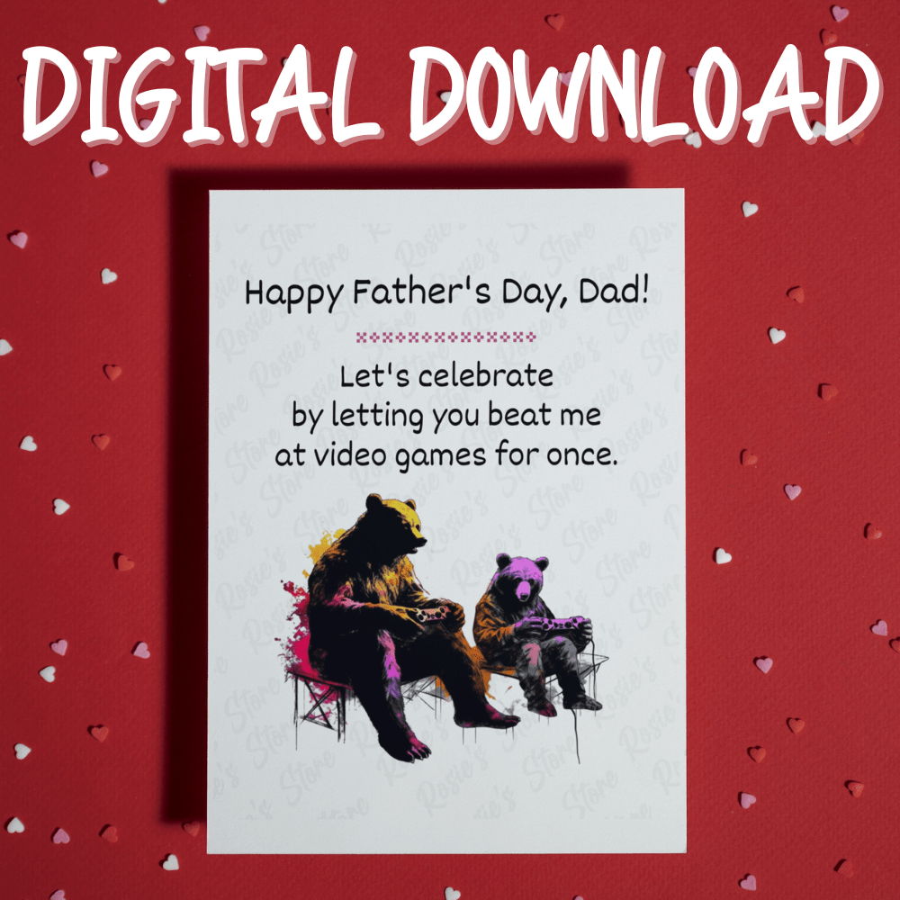 Celebrate Father's Day in gaming style with our "Happy Father's Day, Dad! Let's celebrate by letting you beat me at video games for once" digital download greeting card. Grab yours now, instantly download it, and get ready to create fun memories with your dad. Let the gaming festivities begin!