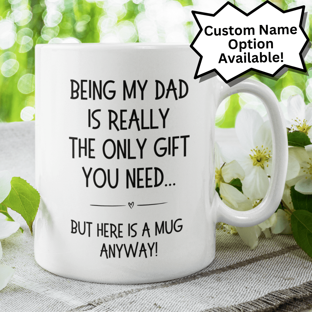 Give your dad a dose of humor with our white ceramic coffee mug that reads, "Being my dad is really the only gift you need...but here is a mug anyway!" It's the perfect way to remind him just how invaluable he is, with a side of laughter to sweeten the deal.
