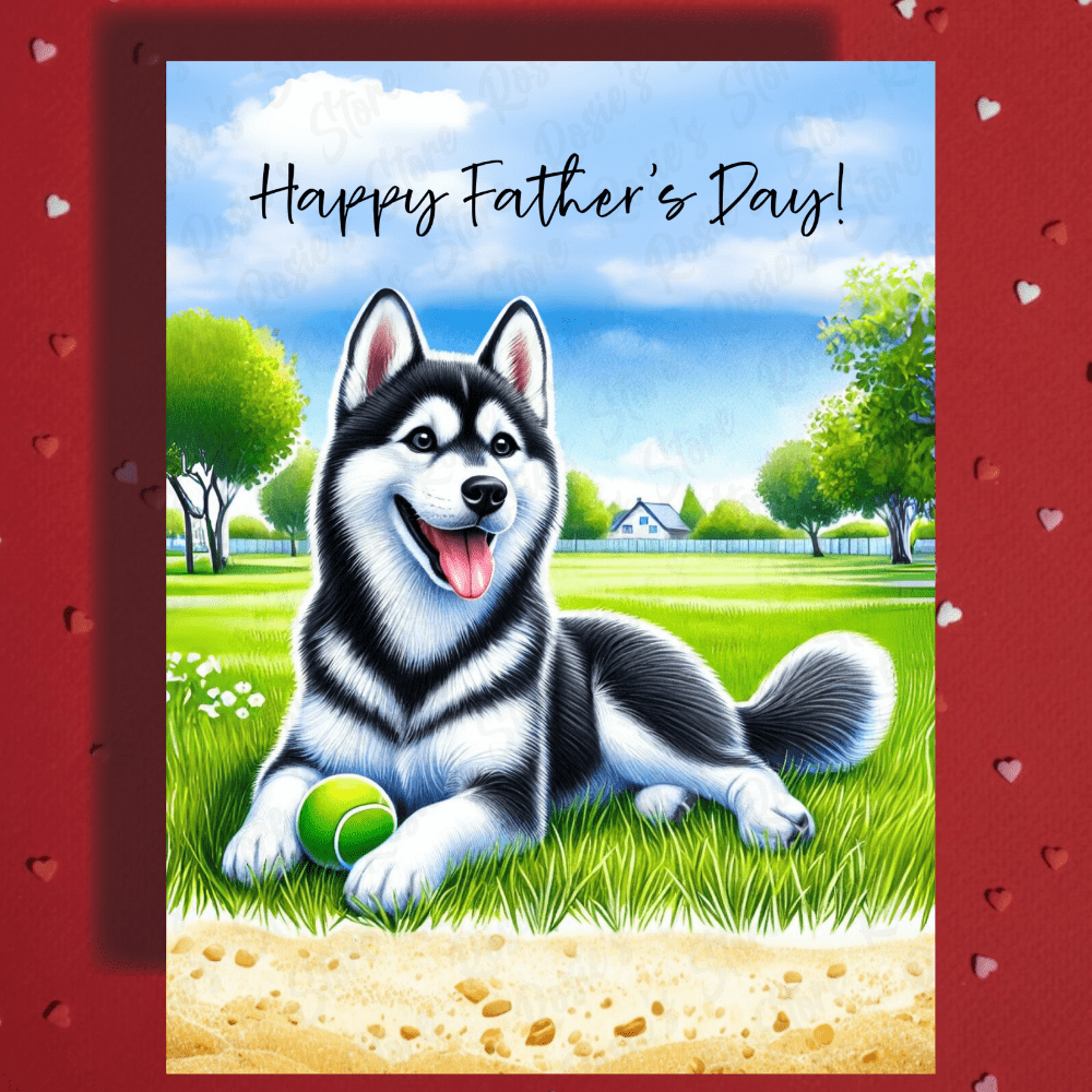 Celebrate the best dog dad with this adorable Father’s Day card featuring a watercolor illustration of a black and white Husky laying in the grass, proudly guarding its favorite ball between its paws! It’s the perfect card for a dad who loves his pup just as much as his kids do! 🐶💙🎾