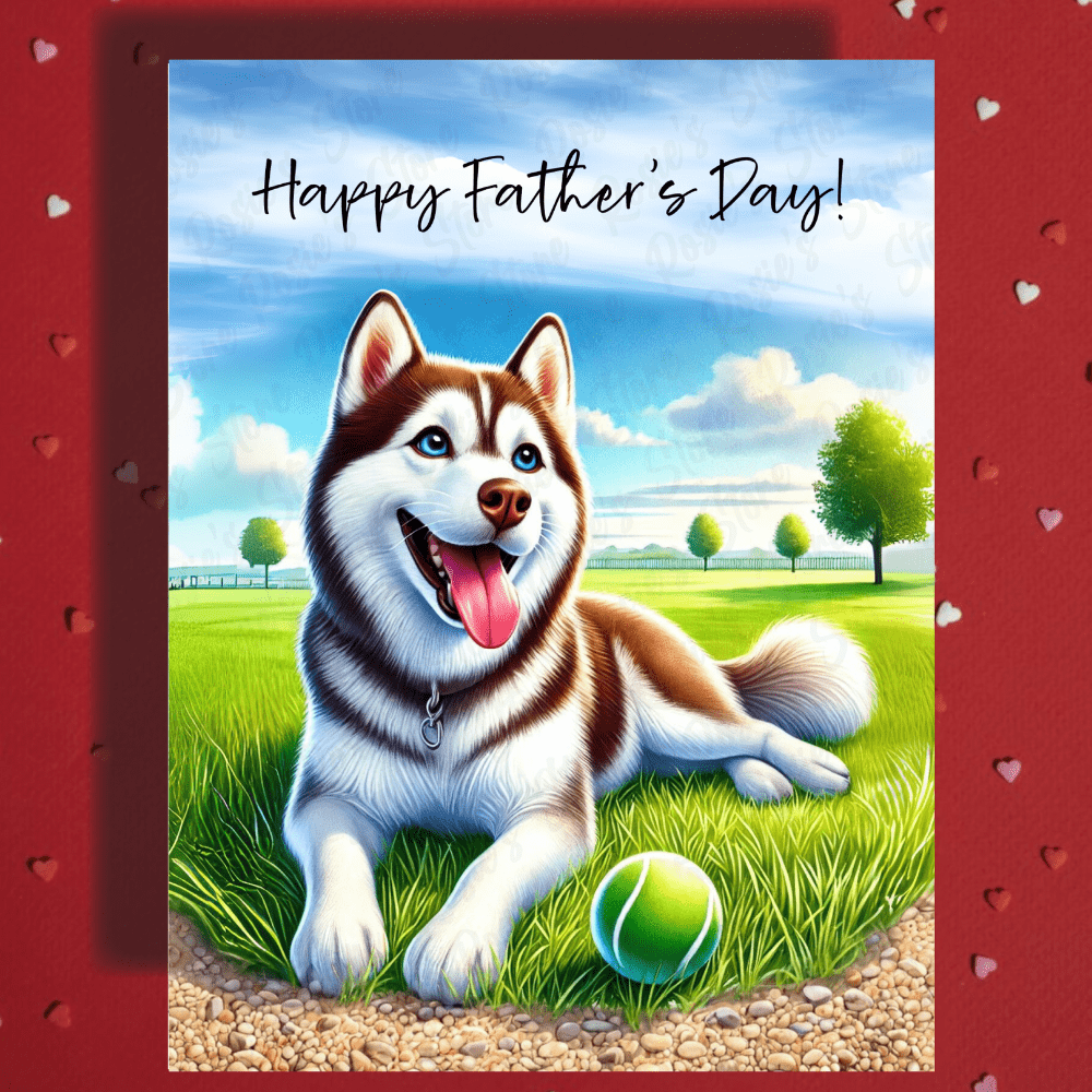 Celebrate Dad with a tail-wagging surprise! This adorable Father’s Day card features a watercolor illustration of a brown and white Husky laying in the grass with its favorite fetching ball right in front—ready to play or nap, just like Dad! 🐕⚽
