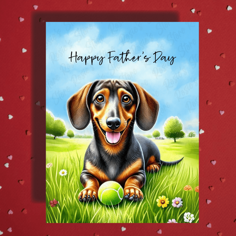 Fetch some smiles this Father’s Day with a card as loyal and lovable as Dad himself! This adorable watercolor greeting card features a cute Dachshund dog laying in the grass with its favorite fetching ball resting between its front paws. 🐶🌿 A sweet and silly way to say thanks to your favorite dog dad, stepdad, or bonus dad!