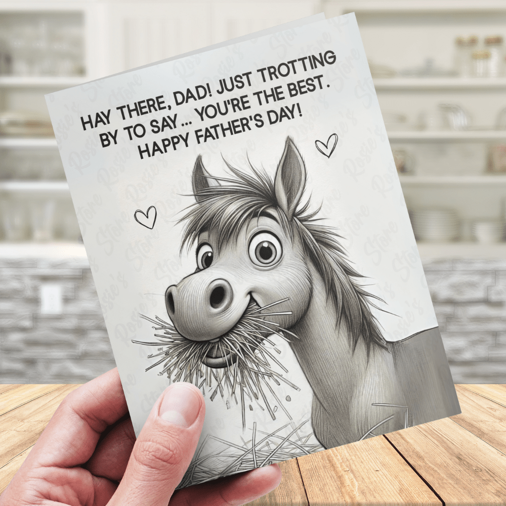 Celebrate Dad with a charming twist of humor and a whole lot of love! This adorable Father’s Day card features a pencil drawing of a cute horse munching on hay, paired with the punny message: