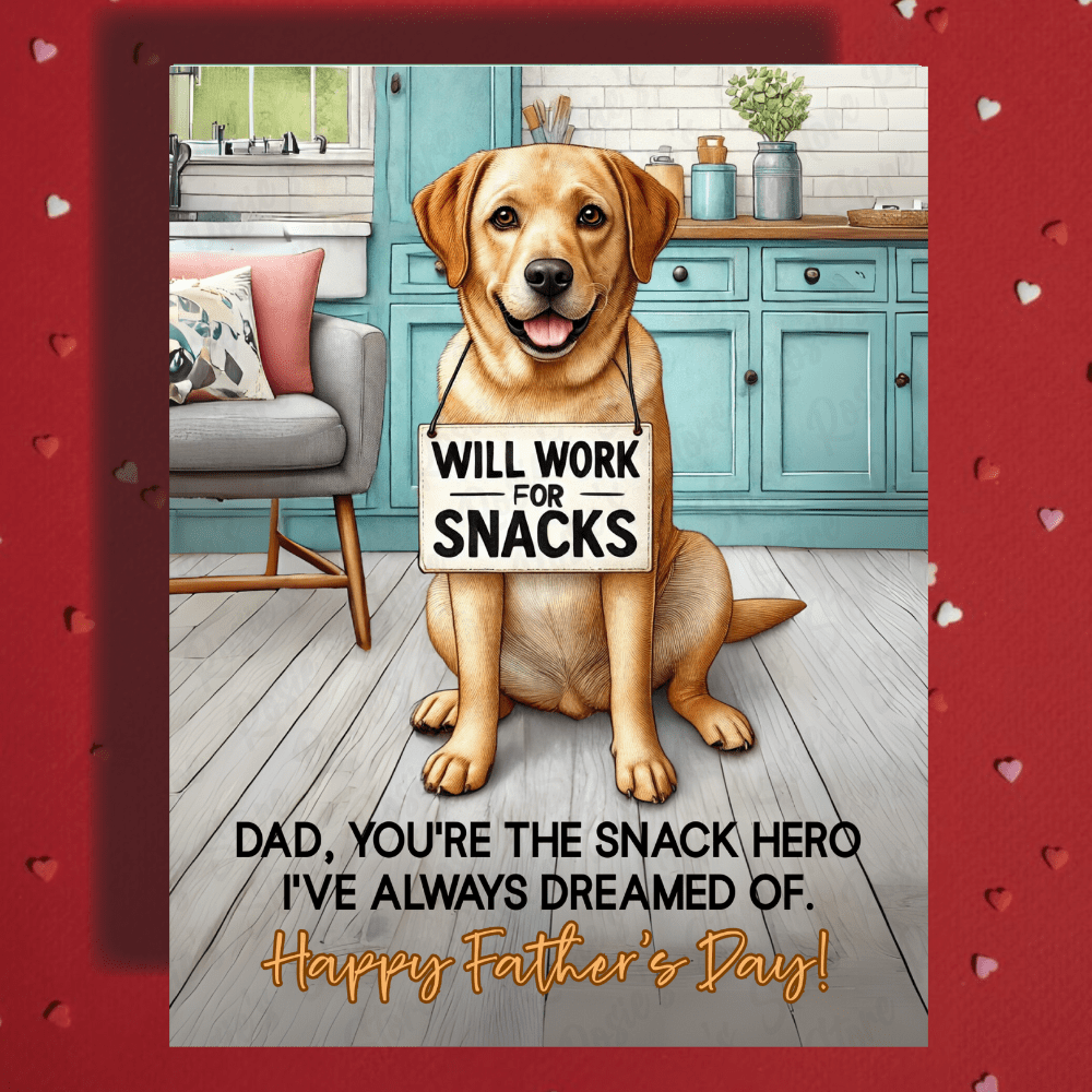 Celebrate the snack-sharing superhero in your life with this adorable and funny Father’s Day card, featuring a watercolor illustration of a lovable Labrador Retriever sitting at the kitchen with a sign around its neck that says 'Will Work for Snacks'. Whether he's your dad, dog dad, bonus dad, or stepdad, this card is the perfect way to say "thanks for always being the real MVP (Master of Very-good-snacks)!"