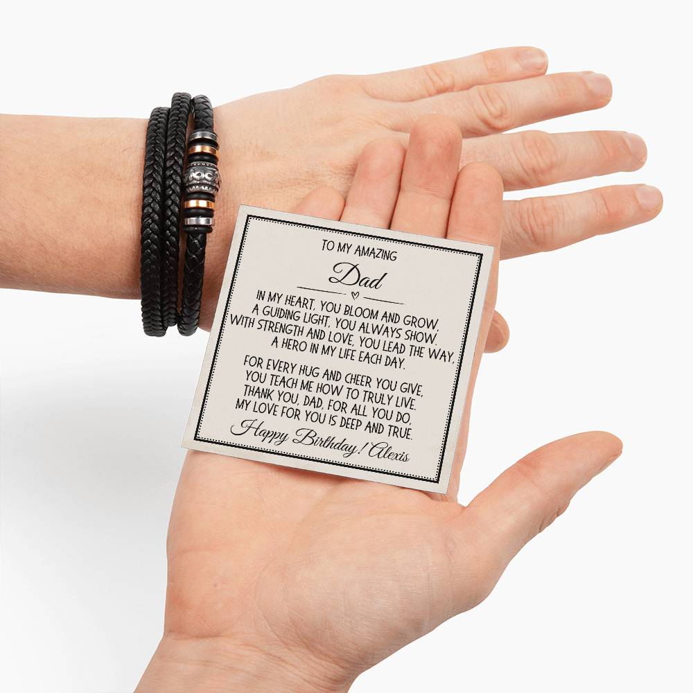 Customize this heartfelt message card with your own short message to create a truly unique gift for your dad. This Men's "Love You Forever" Bracelet is perfect for any occasion! Engraved with a heartfelt message, this gift is great for birthdays, anniversaries, Valentine's Day, or just a thoughtful way to say "I love you." It's not just an accessory; it's a daily reminder of your love and appreciation.