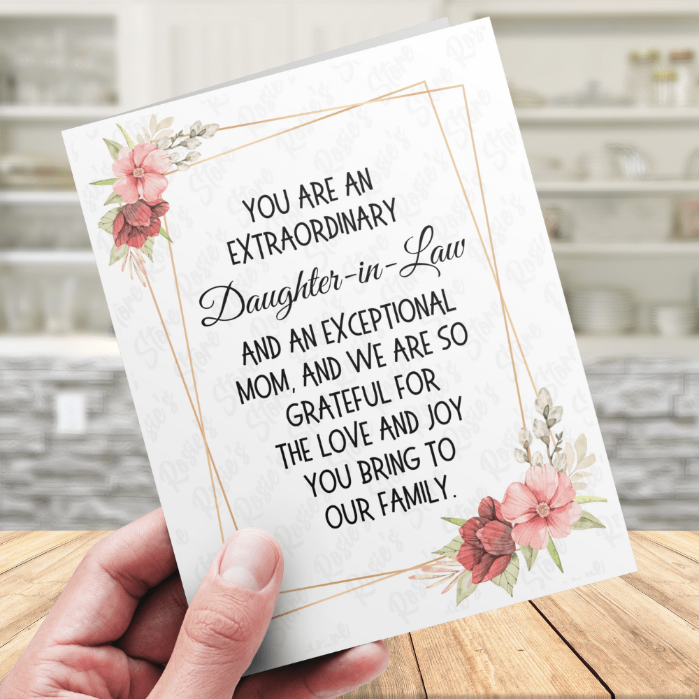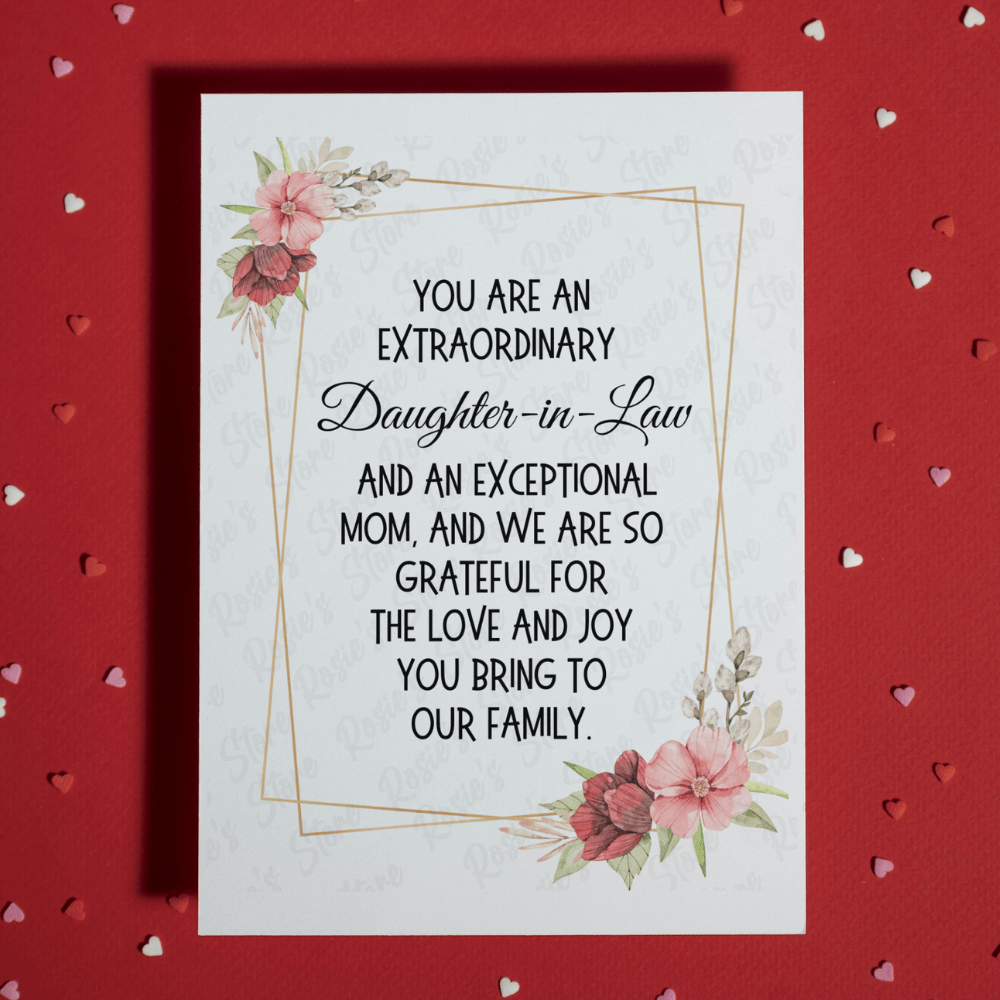 - Front Cover: Features a tasteful cartoon drawing of a beautiful frame adorned with flowers in its corners, encapsulating the message, "You are an extraordinary Daughter-in-Law and an exceptional mom, and we are so grateful for the love and joy you bring to our family." This elegant design highlights her importance and the beauty she adds to your lives.
