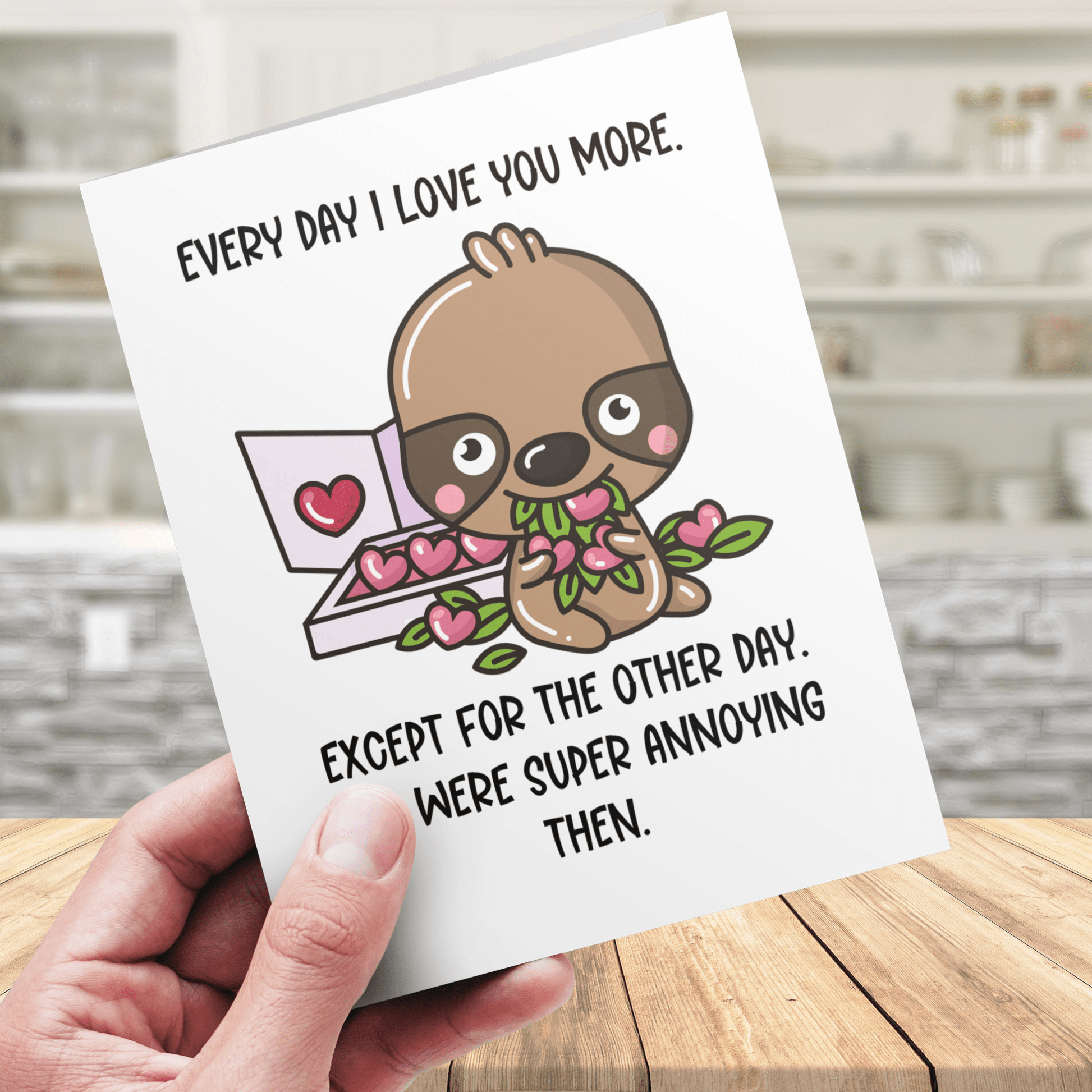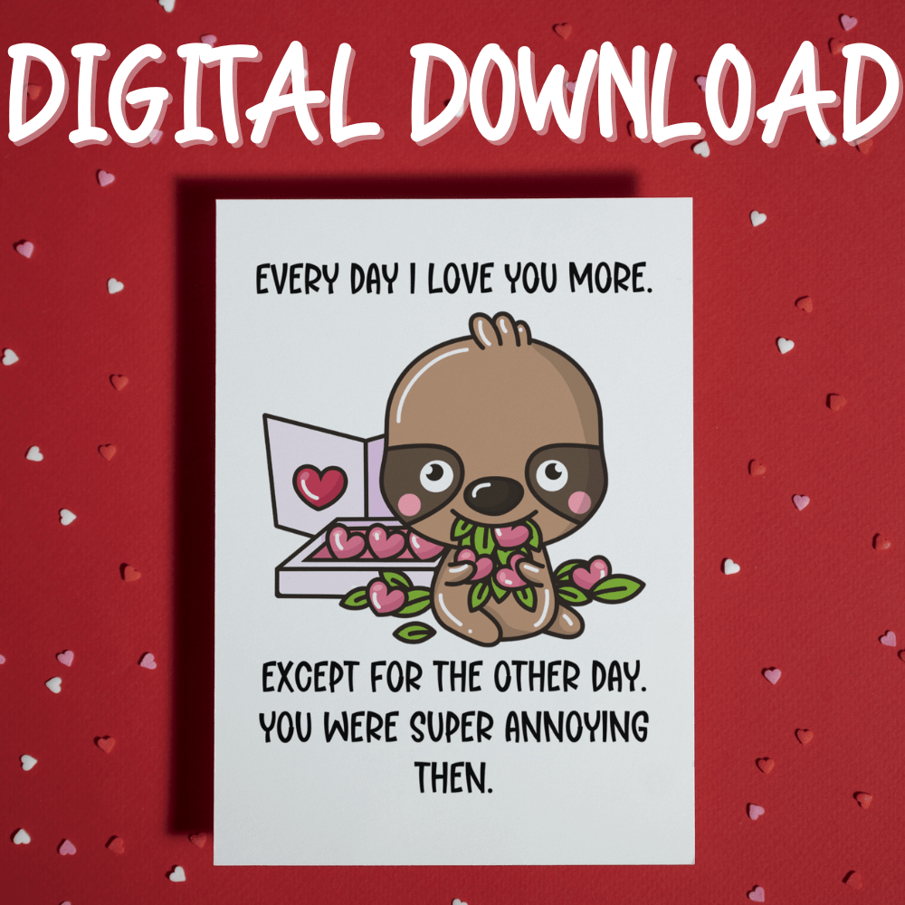 Add a touch of humor to your love with our digital download greeting card. Our "Every day I love you more. Except for the other day. You were super annoying then." card playfully expresses the ups and downs of a relationship while showcasing the enduring love you share.