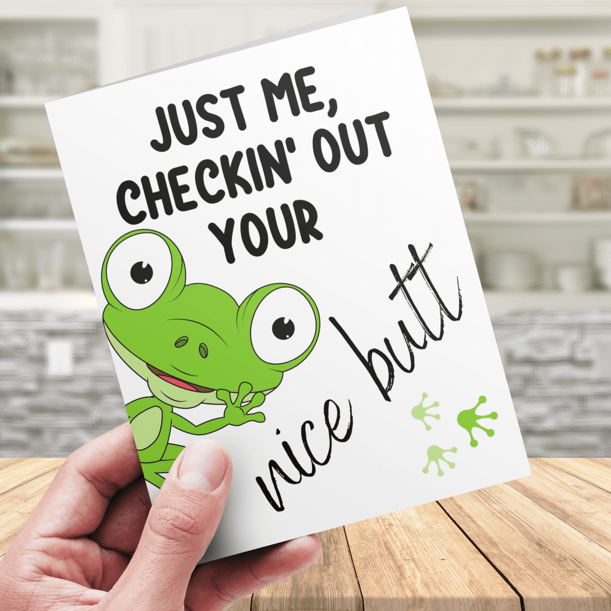 On the front page, you'll find an enchanting illustration of a frog with a mischievous grin, accompanied by the humorous phrase, "Just me checkin' out your butt." This cheeky line sets the tone for the delightful surprise waiting inside.