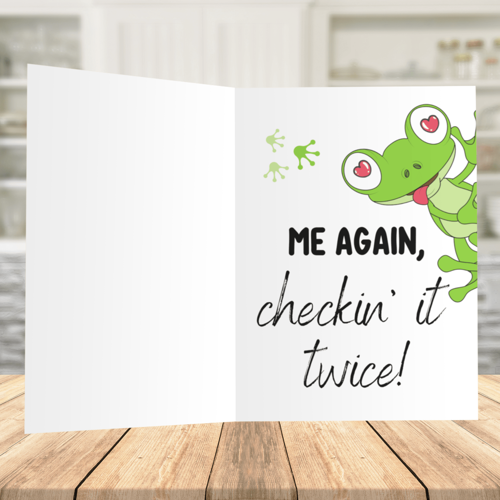 Open up the card, and you'll discover the continuation of the fun with the words, "Me again checkin' it twice." It's a playful twist on a familiar phrase that is sure to bring a smile to the recipient's face.