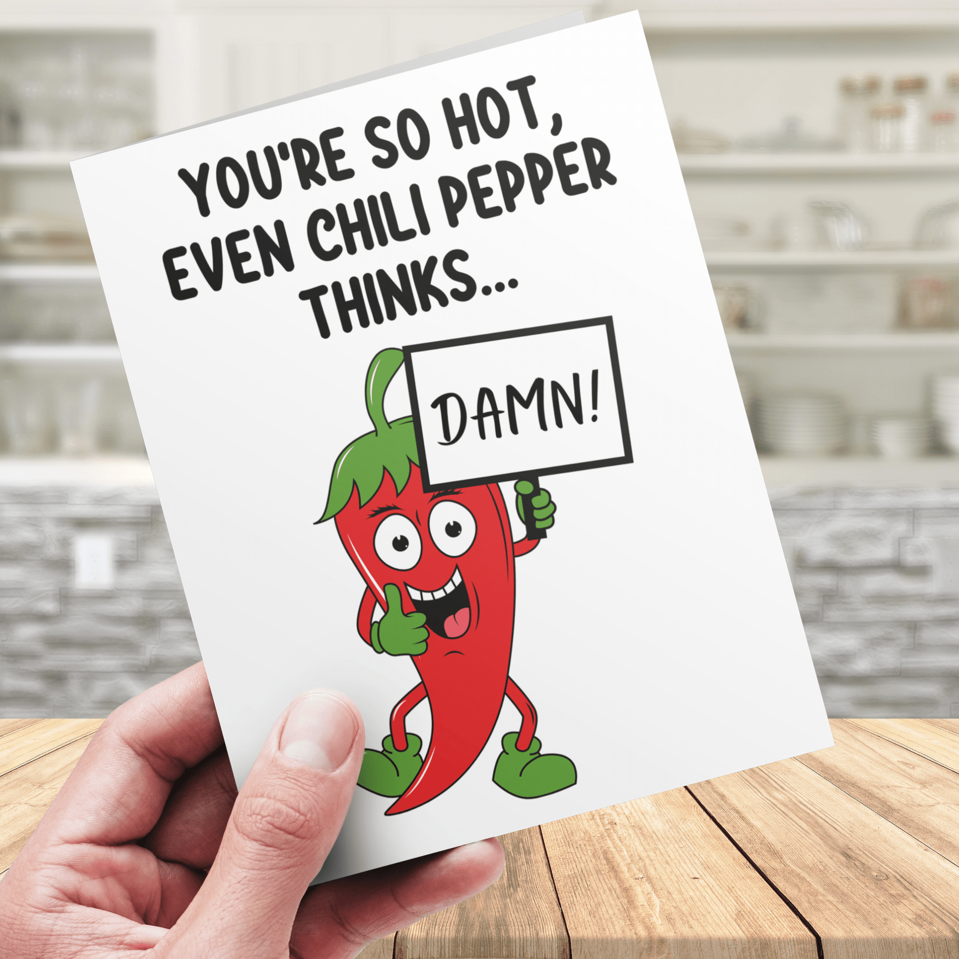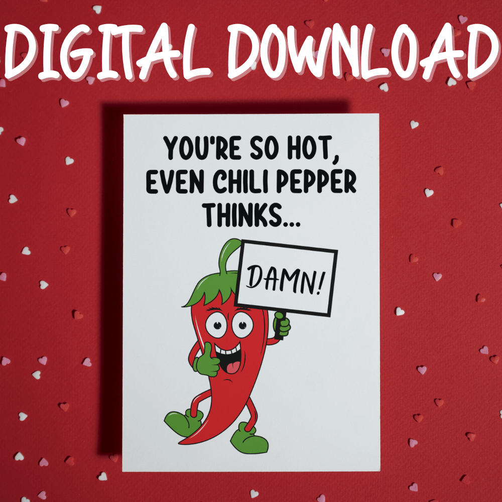 Spice up someone's day with our sizzling digital download greeting card. Our "You're so hot, even chili pepper thinks...DAMN!" card adds a touch of humor and flattery to let someone know just how smokin' they are.