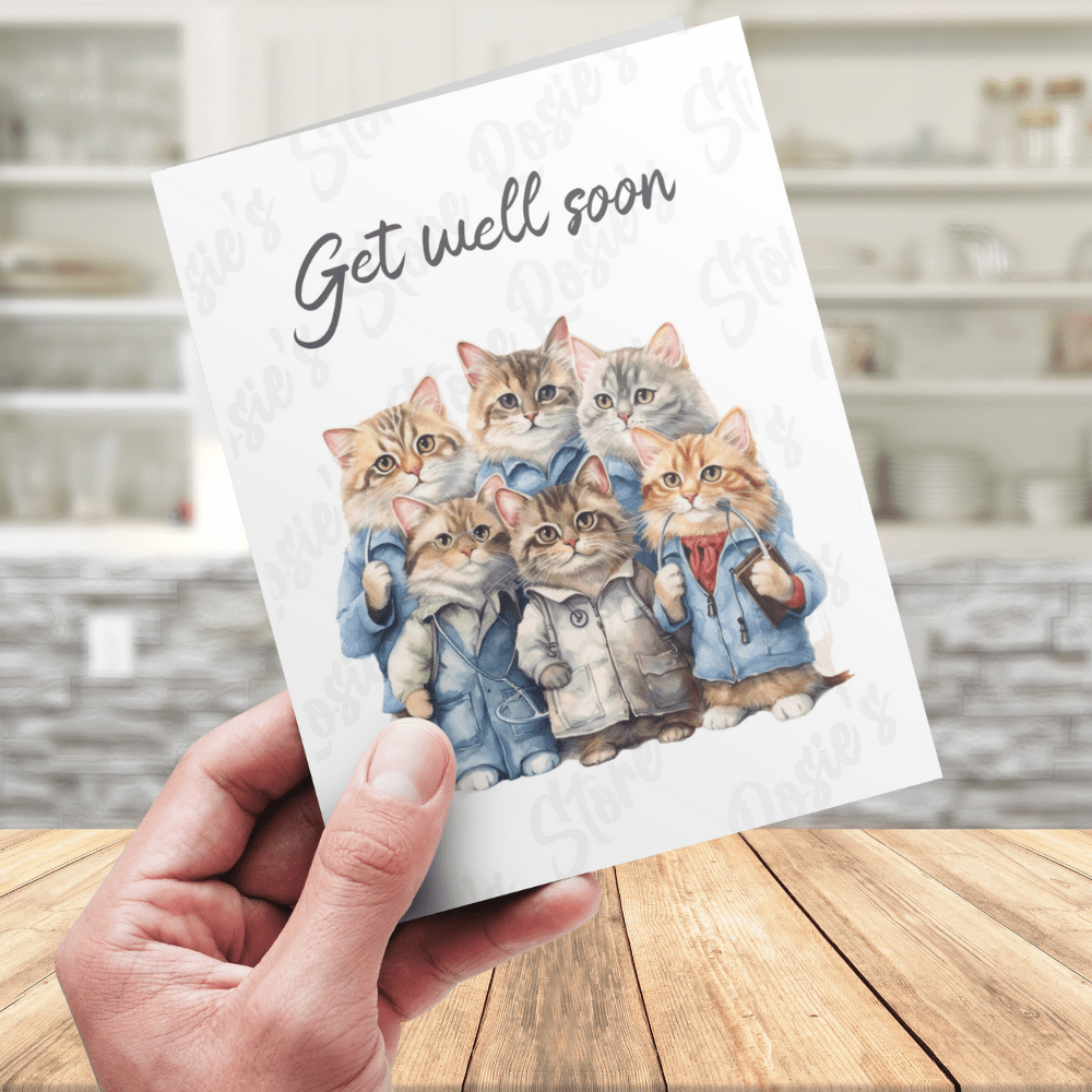 The front of the card features a charming illustration of adorable cats dressed in blue coats, and stethoscopes around their necks. They're depicted as caring doctors, with concerned expressions on their faces, offering comfort and support to the recipient. The playful design is guaranteed to bring a smile to anyone's face. There will be no watermarks on the card.
