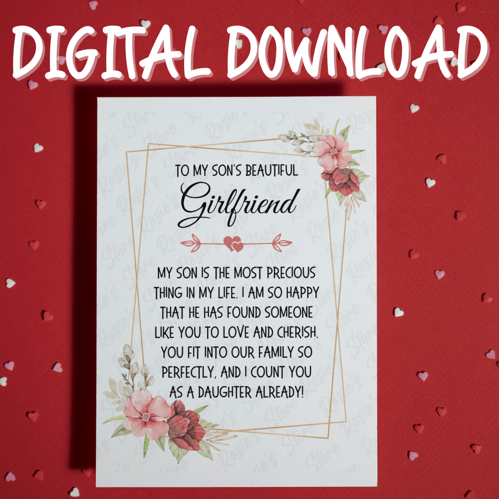 Upon purchase, you will receive a file that can be easily saved and accessed on your device. The message conveys a deep appreciation for the son's girlfriend, recognizing her as a cherished addition to the family and expressing joy in her relationship with the son.