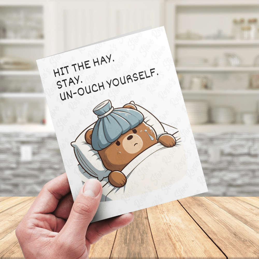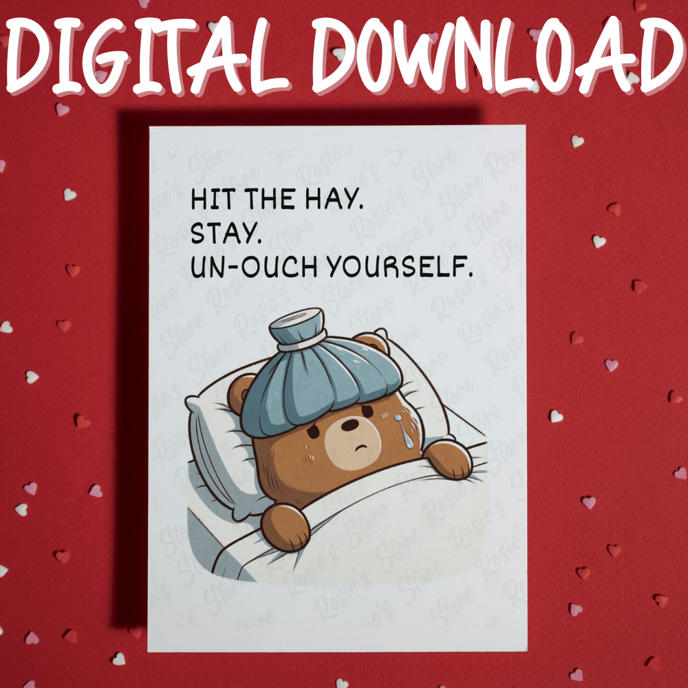 Send some smiles and good vibes with this adorable "Hit the hay. Stay. Un-ouch yourself." card. 🛌🐻 Explore our collection for more digitally downloadable gems to uplift your loved ones! 🌈✨* These are a .png & .pdf files download only, it is NOT a card and envelope.