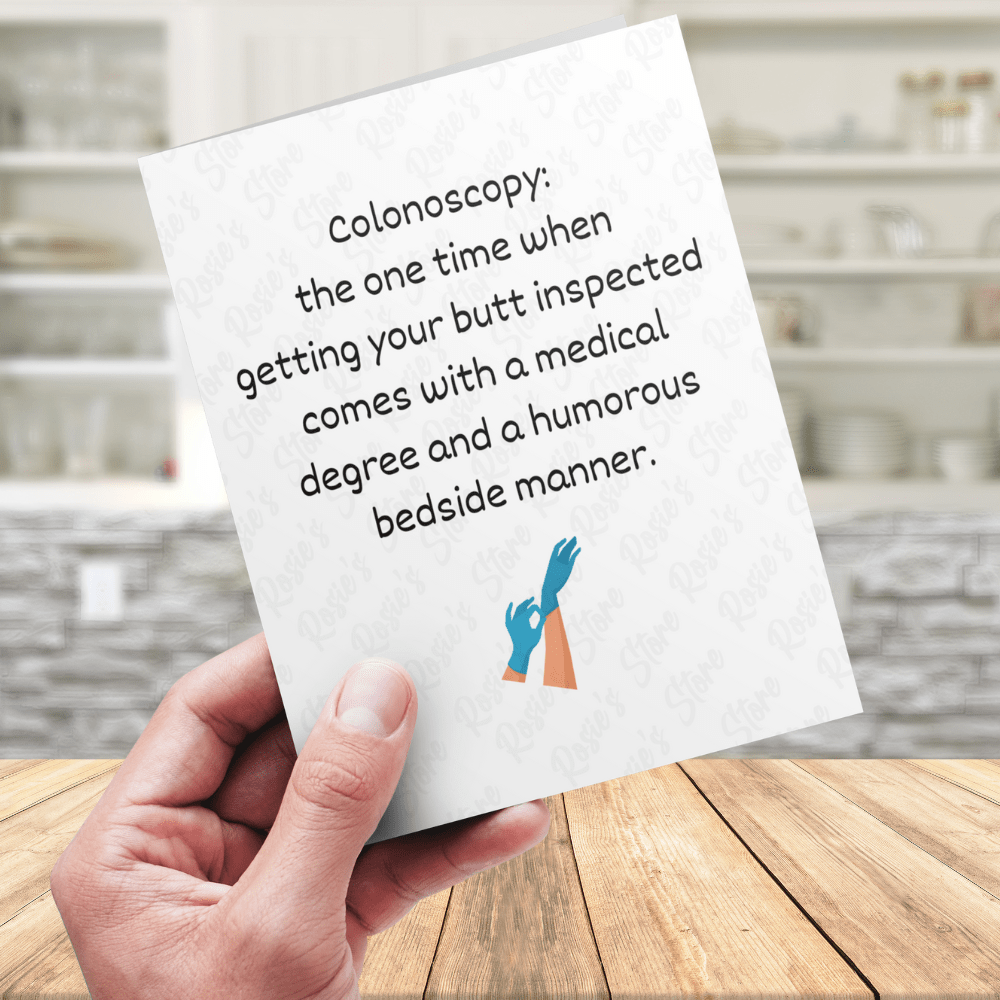 The front of the card reads "Colonoscopy: the one time when getting your butt inspected comes with a medical degree and a humorous bedside manner." While this may seem like a lighthearted joke, it can actually serve as a way to help alleviate some of the stress and anxiety that can come with undergoing this procedure.