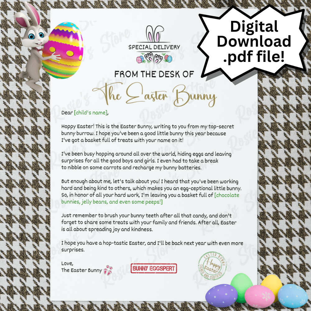 Hop into the Easter Spirit! Surprise your child or grandchild this year with a personalized Letter from the Easter Bunny! Create special memories and treasured keepsakes for your kids with this 8.5x11" printable letter from the Easter Bunny!