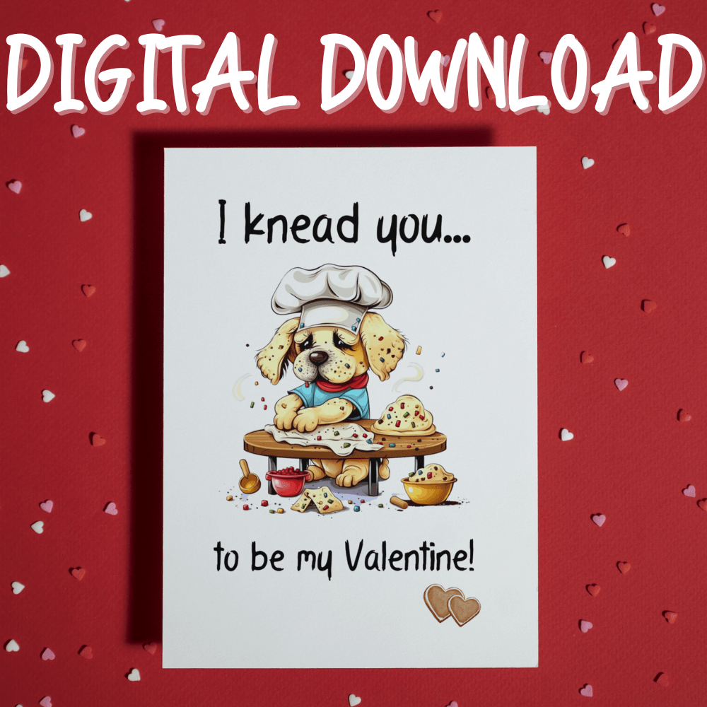 Embrace the cuteness and warmth of our digital download greeting card. Purchase yours today and let your loved one know that you "knead" them to be your Valentine, just like the adorable chef cook dog kneading dough.