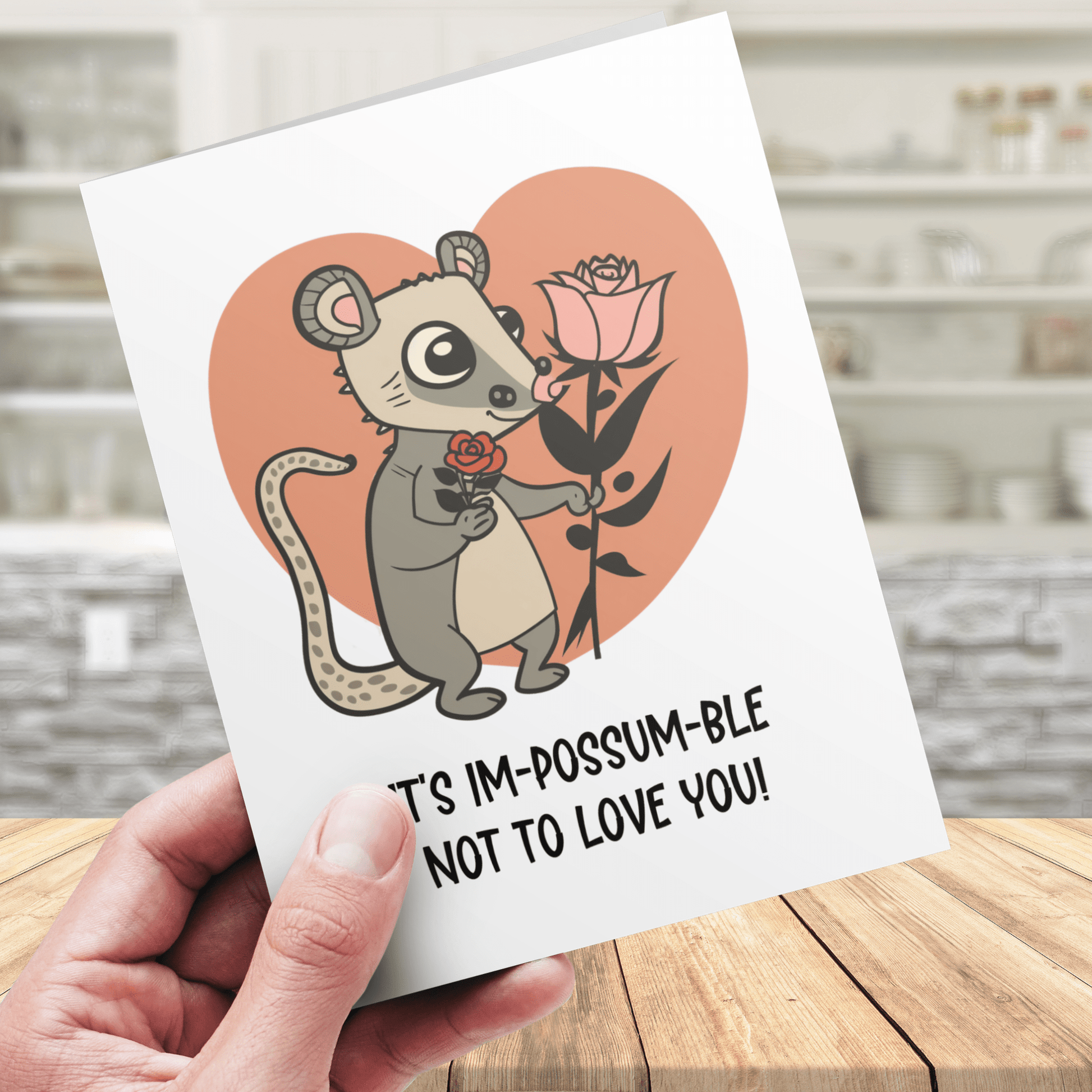Spread some adorable love with our digital download greeting card. Our "It's im-possum-ble not to love you!" card features a cute cartoon of a possum and is the perfect way to express affection and adoration.