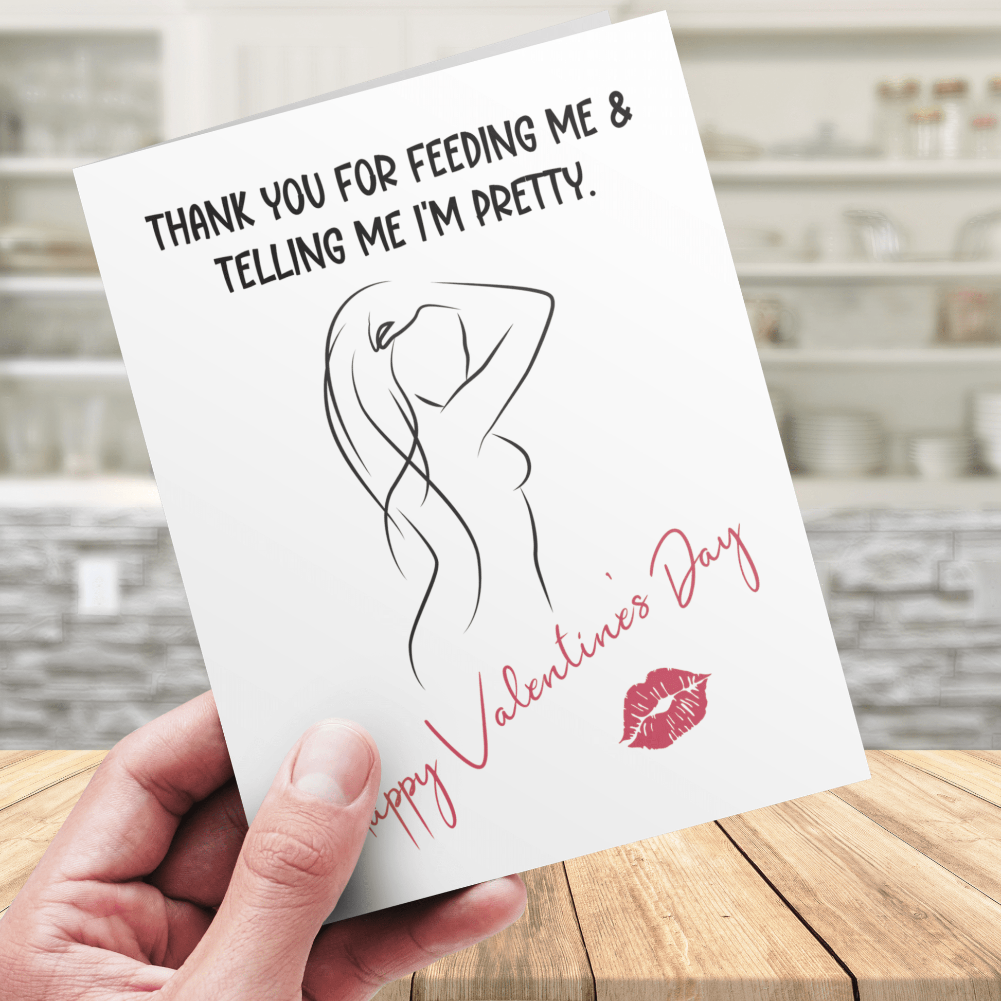 Celebrate love and humor this Valentine's Day with our cheeky digital download greeting card. Our "Thank you for feeding me & telling me I'm pretty. Happy Valentine's Day" card features a cartoon drawing of a sexy woman outlining, adding a playful twist to your message.