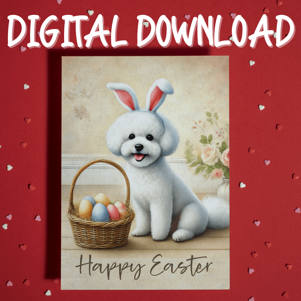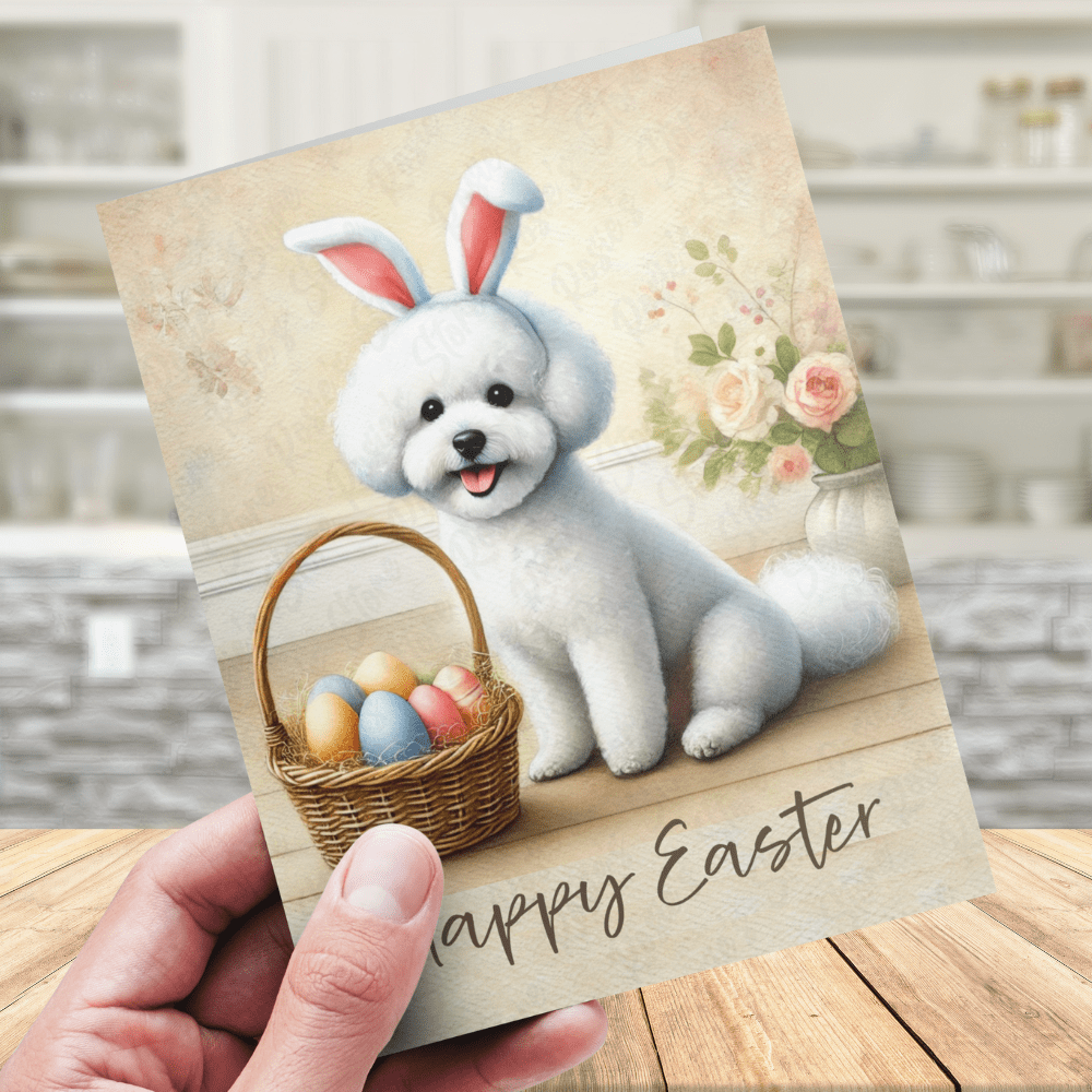 - Design: Features a charming watercolor illustration of a fluffy Bichon Frise wearing bunny ears, standing beside a festive Easter basket, making it the perfect blend of cuteness and holiday cheer.