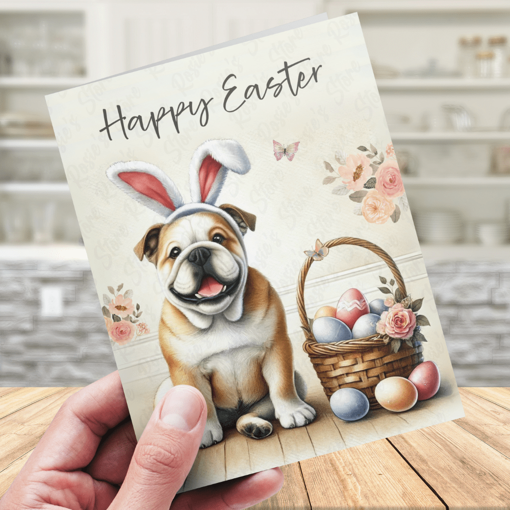 - Design: Showcases a charming watercolor illustration of a Bulldog dog wearing bunny ears, standing beside a festive Easter basket, bringing a mix of cuteness and holiday cheer.