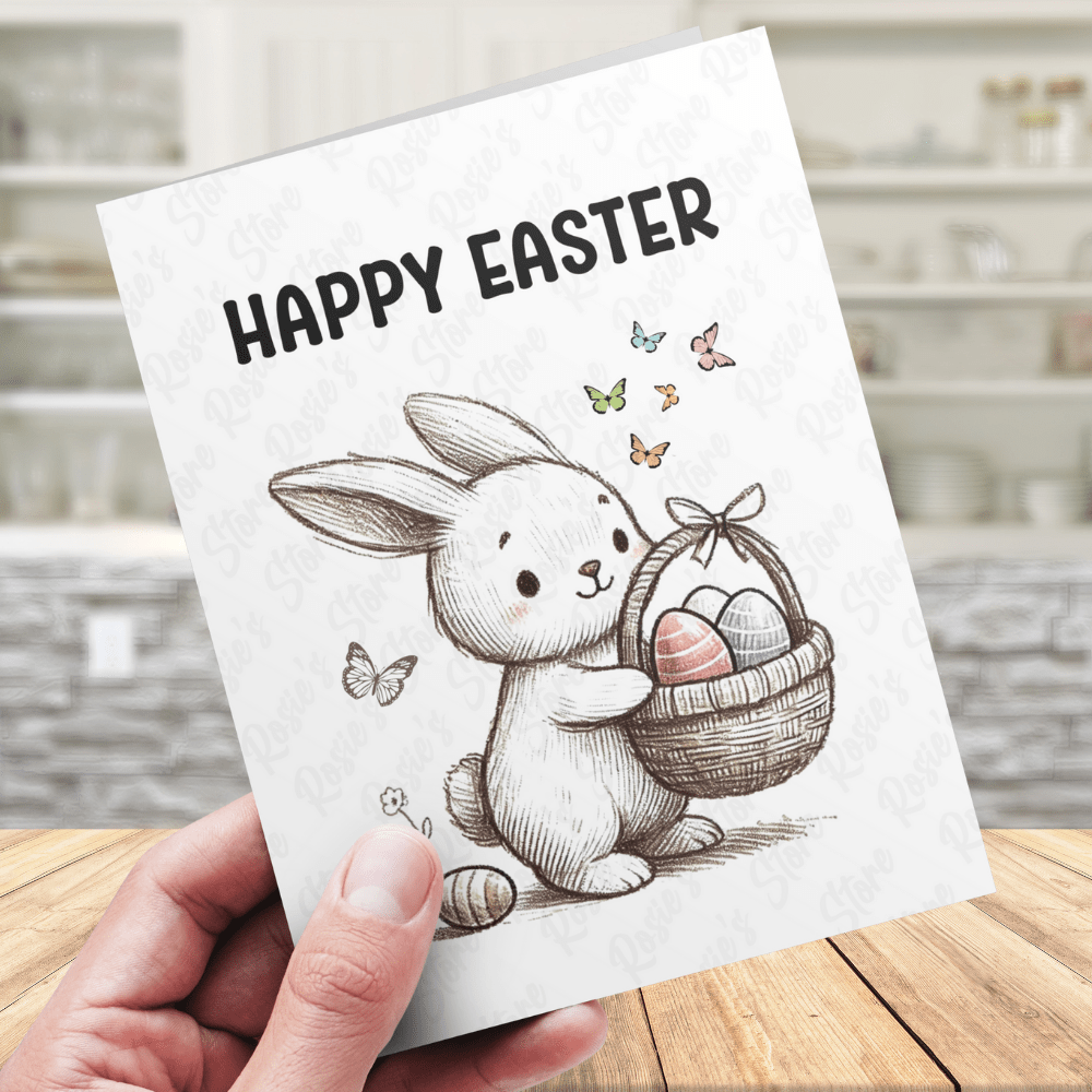 - Design: Features an adorable cartoon illustration of an Easter Bunny holding an Easter basket, filled with colorful eggs, radiating warmth and holiday cheer.