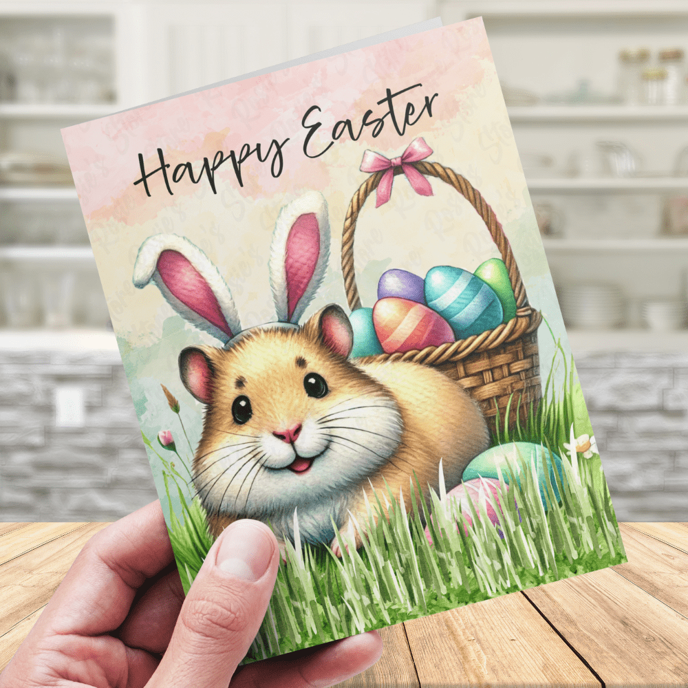 - Design: Showcases a charming watercolor illustration of a hamster wearing bunny ears, sweetly laying next to a festive Easter basket, bringing a heartwarming touch of holiday joy.