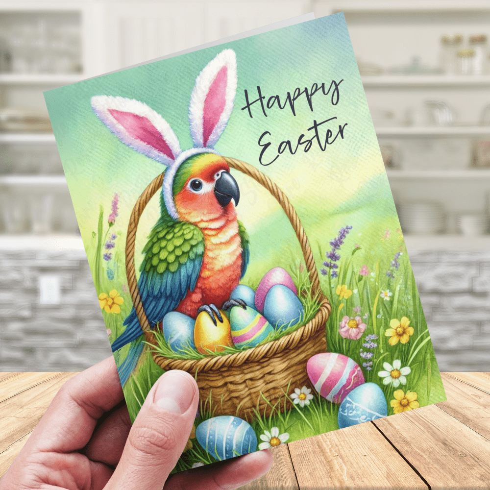 - Design: Features a charming watercolor illustration of a parrot wearing bunny ears, sitting inside a festive Easter basket, bringing a delightful and unique twist to traditional Easter designs.
