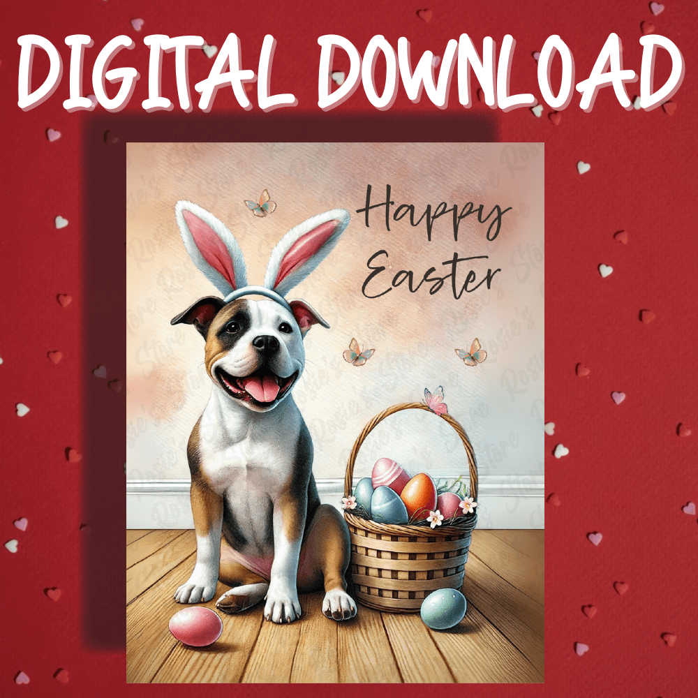 - Design: Features a charming watercolor illustration of a Pitbull dog wearing bunny ears, standing beside a festive Easter basket, bringing a mix of cuteness and holiday cheer.