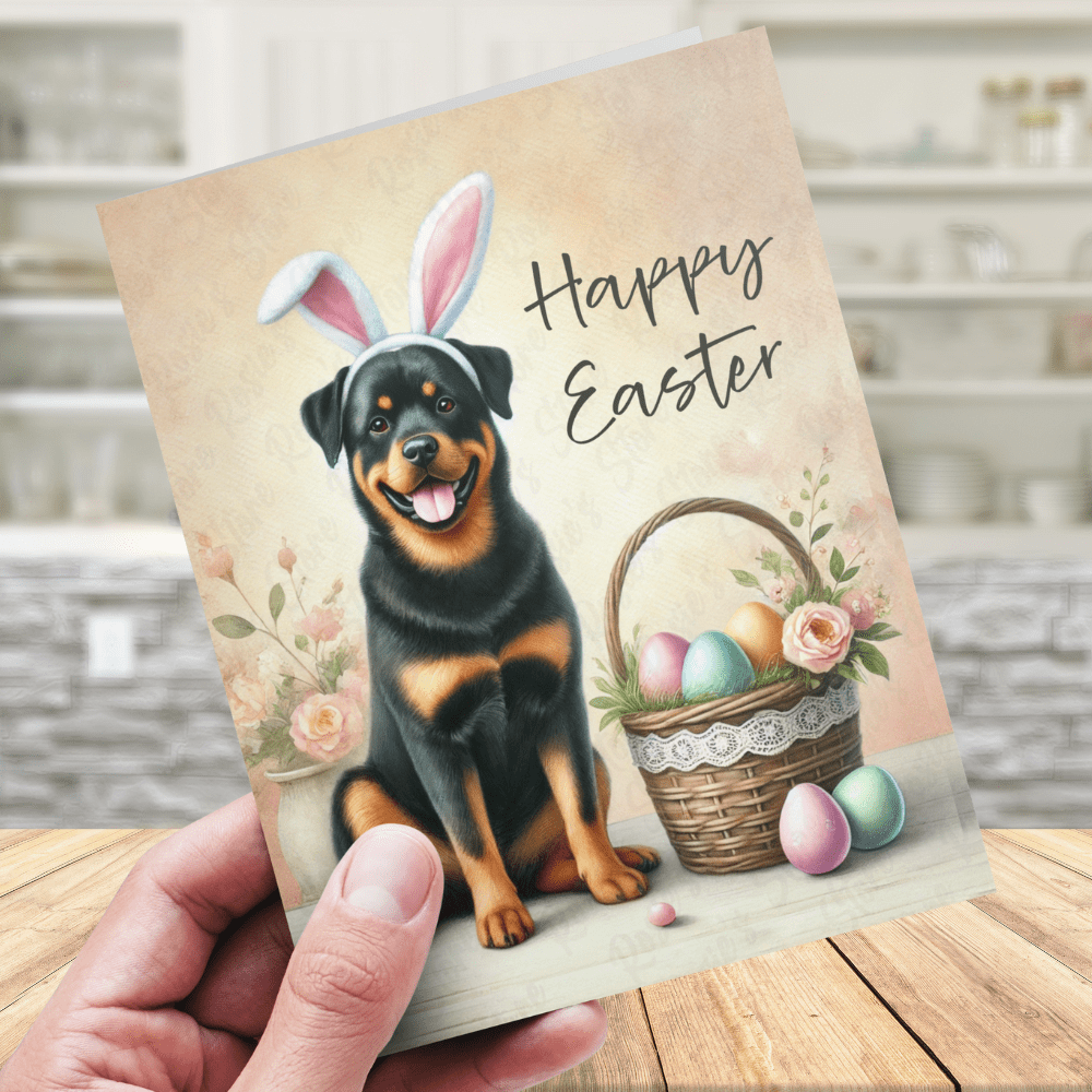 - Design: Showcases a charming watercolor illustration of a Rottweiler dog wearing bunny ears, standing next to a festive Easter basket, bringing the perfect mix of cuteness and holiday cheer.